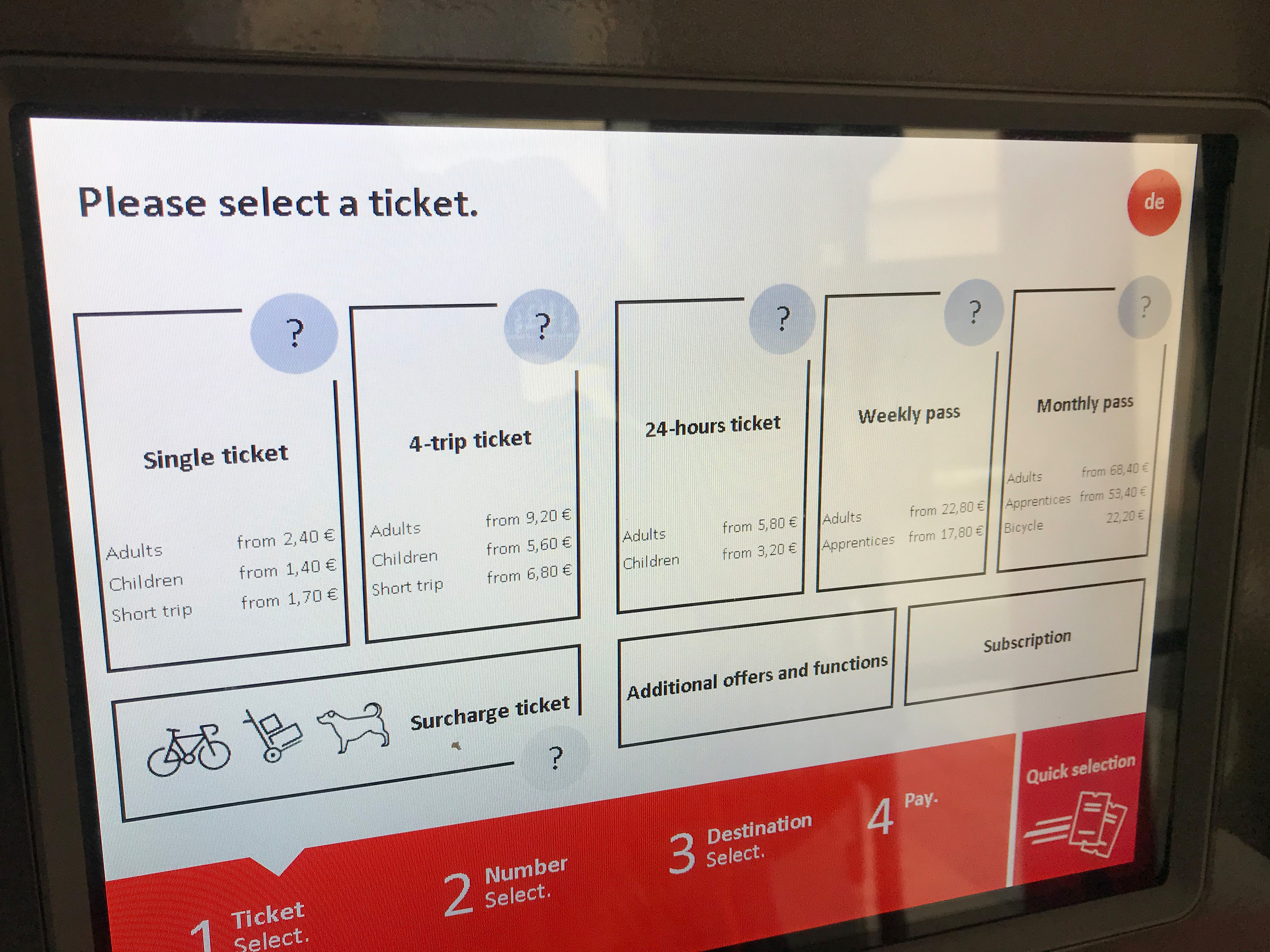 Die englischsprachige Menüführung an einem Fahrkartenautomaten der HAVAG.