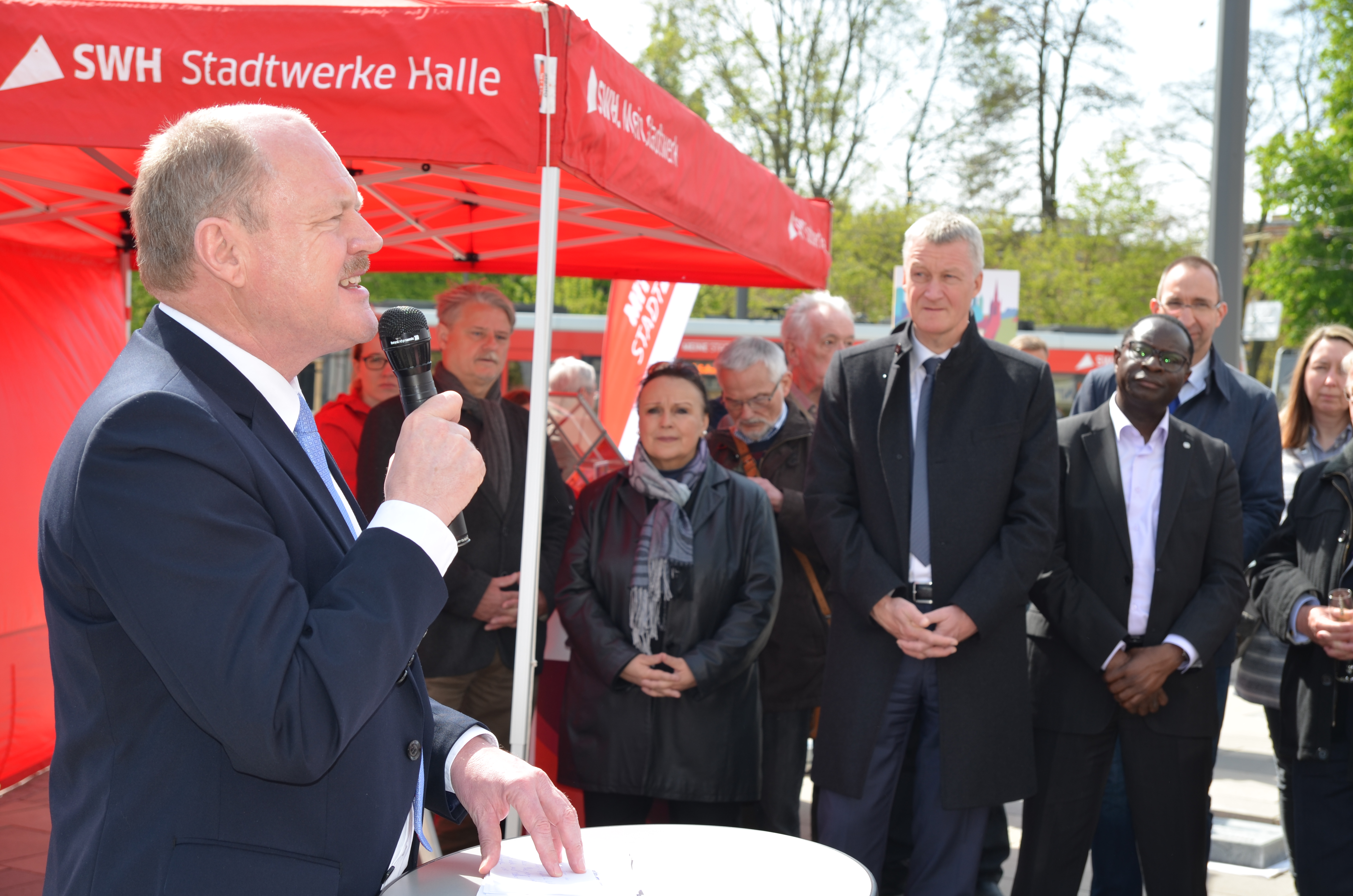 Thomas Webel, Minister für Landesentwicklung und Verkehr Sachsen-Anhalt und Dr. Bernd Wiegand, Oberbürgermeister der Stadt Halle (Saale) setzten symbolisch den Schlussstein.