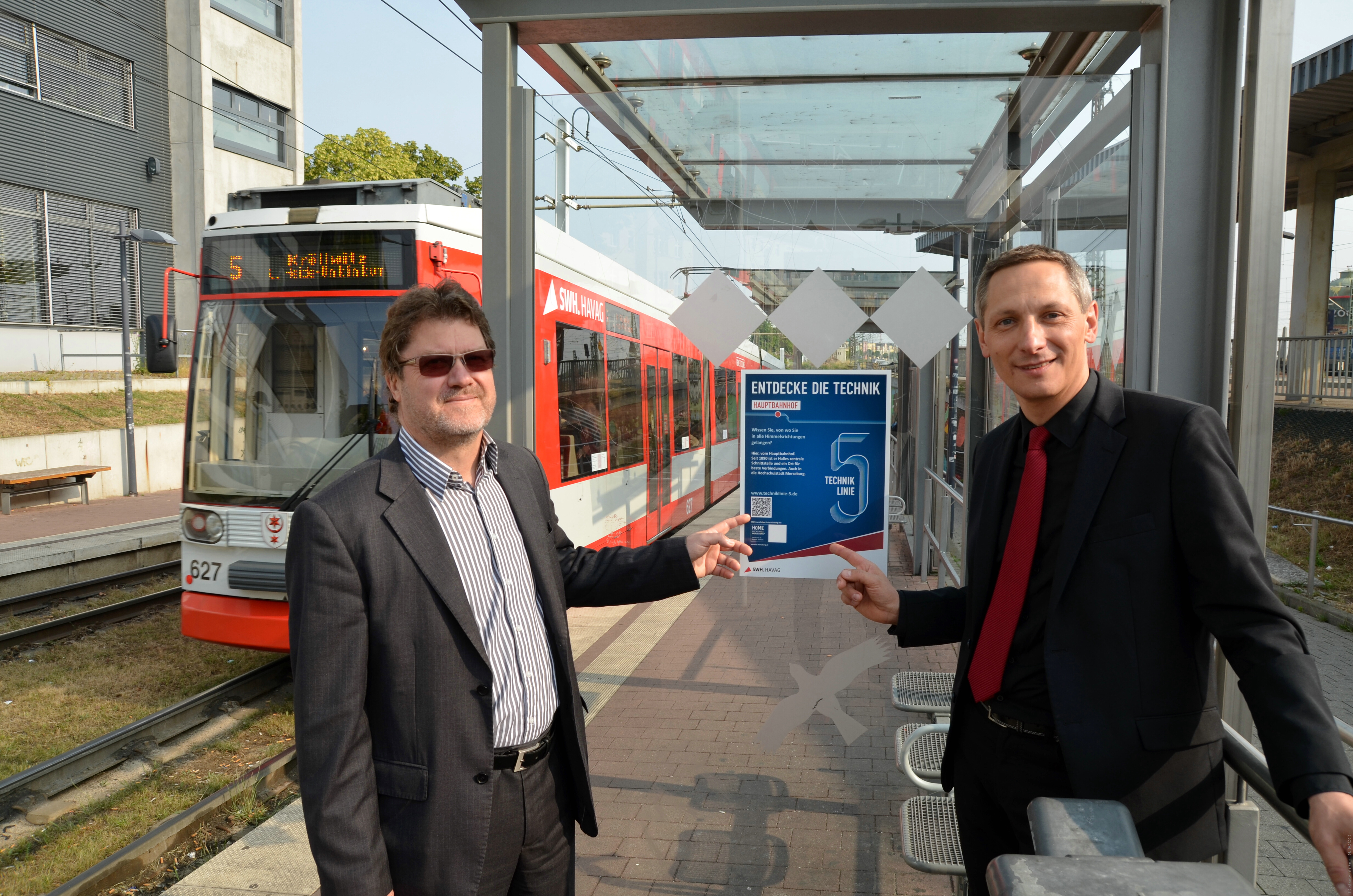 Professor Doktor Jörg Kirbs, Rektor der Hochschule Merseburg links), sowie Vinzenz Schwarz, Vorstand der Halleschen Verkehrs-AG (rechts), bei der Übergabe der Haltestelle Hauptbahnhof Halle.
