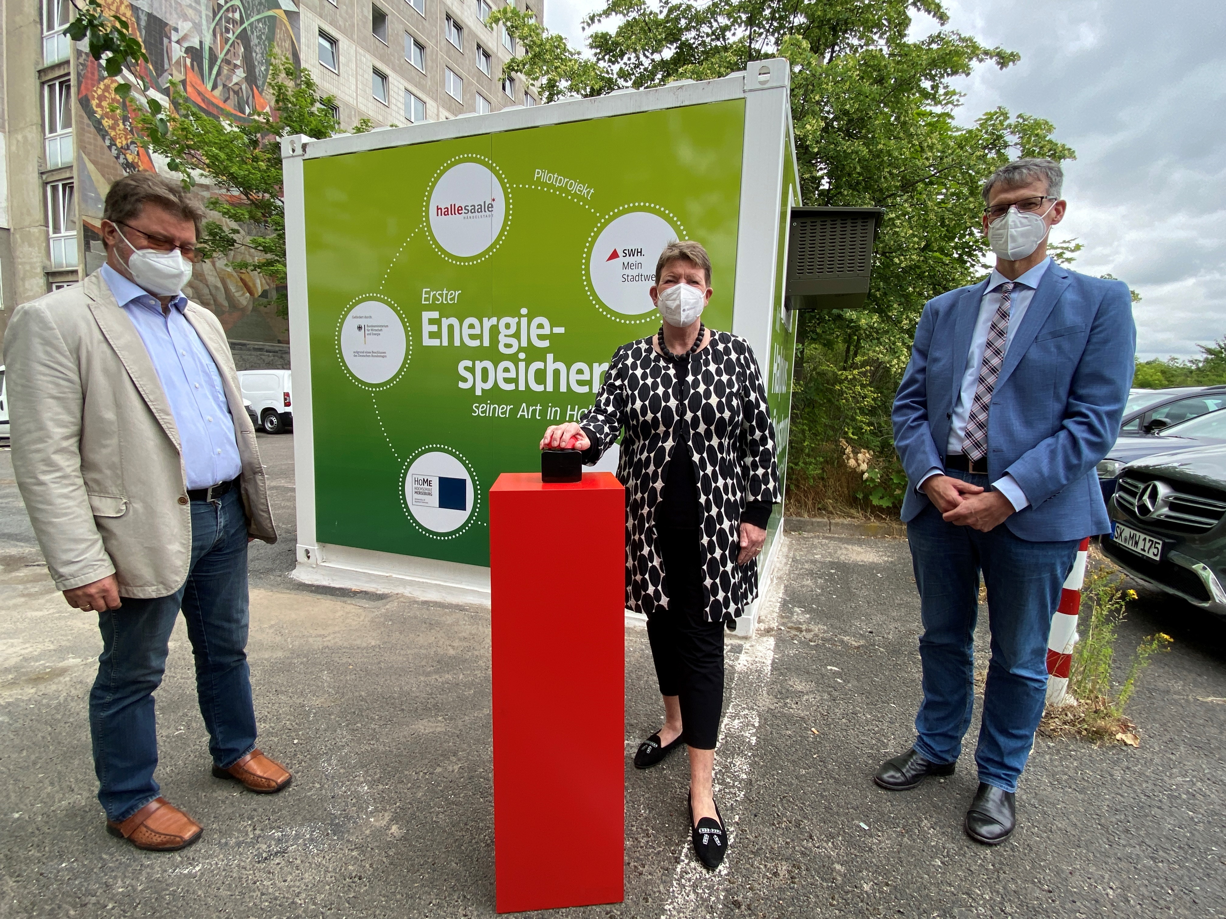 Heute wurde durch die Stadt Halle (Saale) das innovative eSpeicher-System in Betrieb genommen. Anwesend waren neben Vertreter*innen der Projektbeteiligten und Medien auch Ministerin Prof. Dr. Claudia Dalbert des Ministeriums für Umwelt, Landwirtschaft und Energie Sachsen-Anhalt.