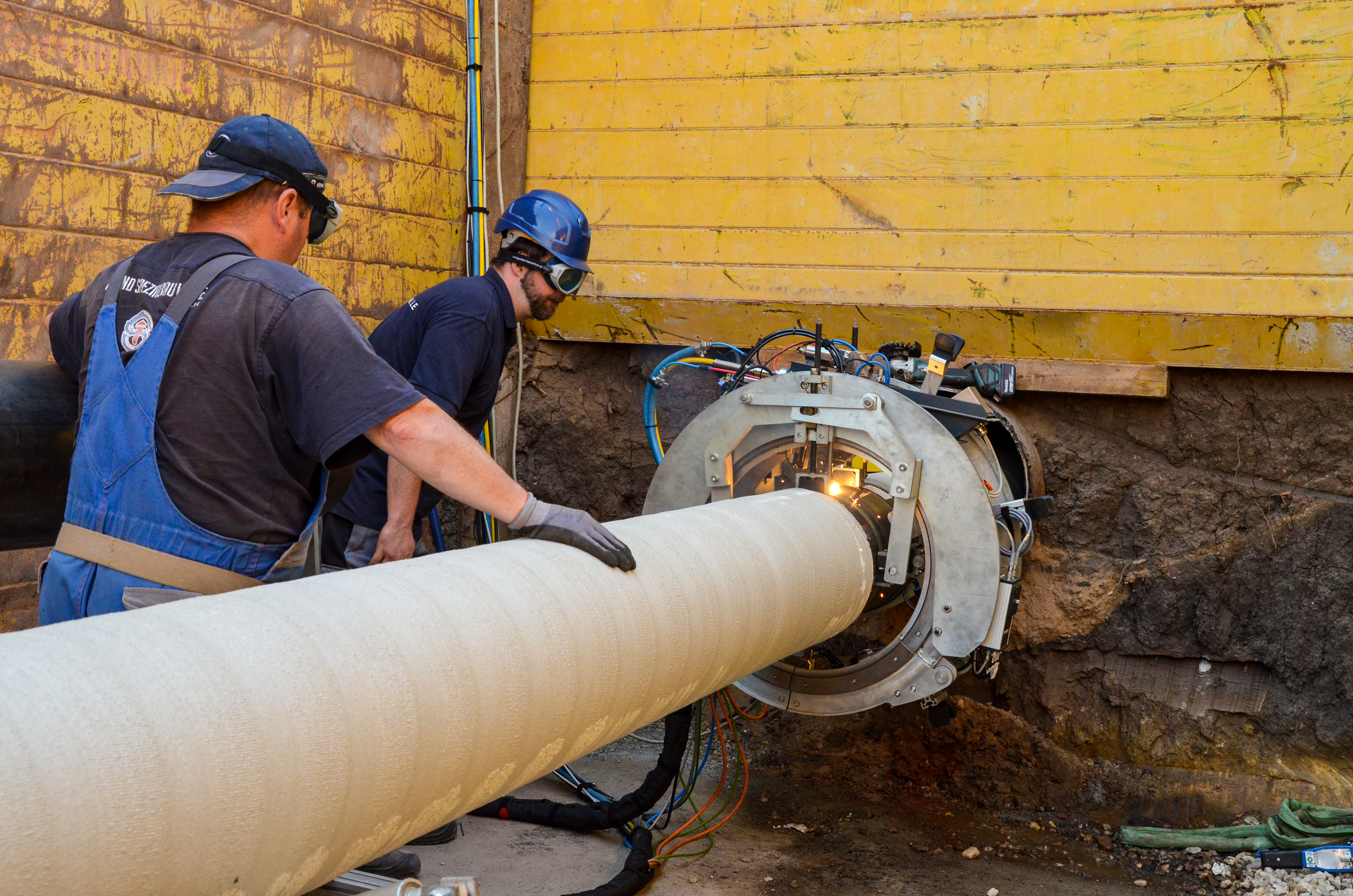 In der Magdeburger Chaussee erneuert die HWS derzeit eine Trinkwasserleitung durch Rohreinzug auf einer Länge von 250 Metern. Dabei kommt erstmals das innovative orbitale Laserschweißverfahren auf einer Baustelle zum Einsatz. In nur 30 bis 90 Sekunden fährt der neue Automat um die Trinkwasserleitung herum und schweißt die Rohrendungen zusammen.