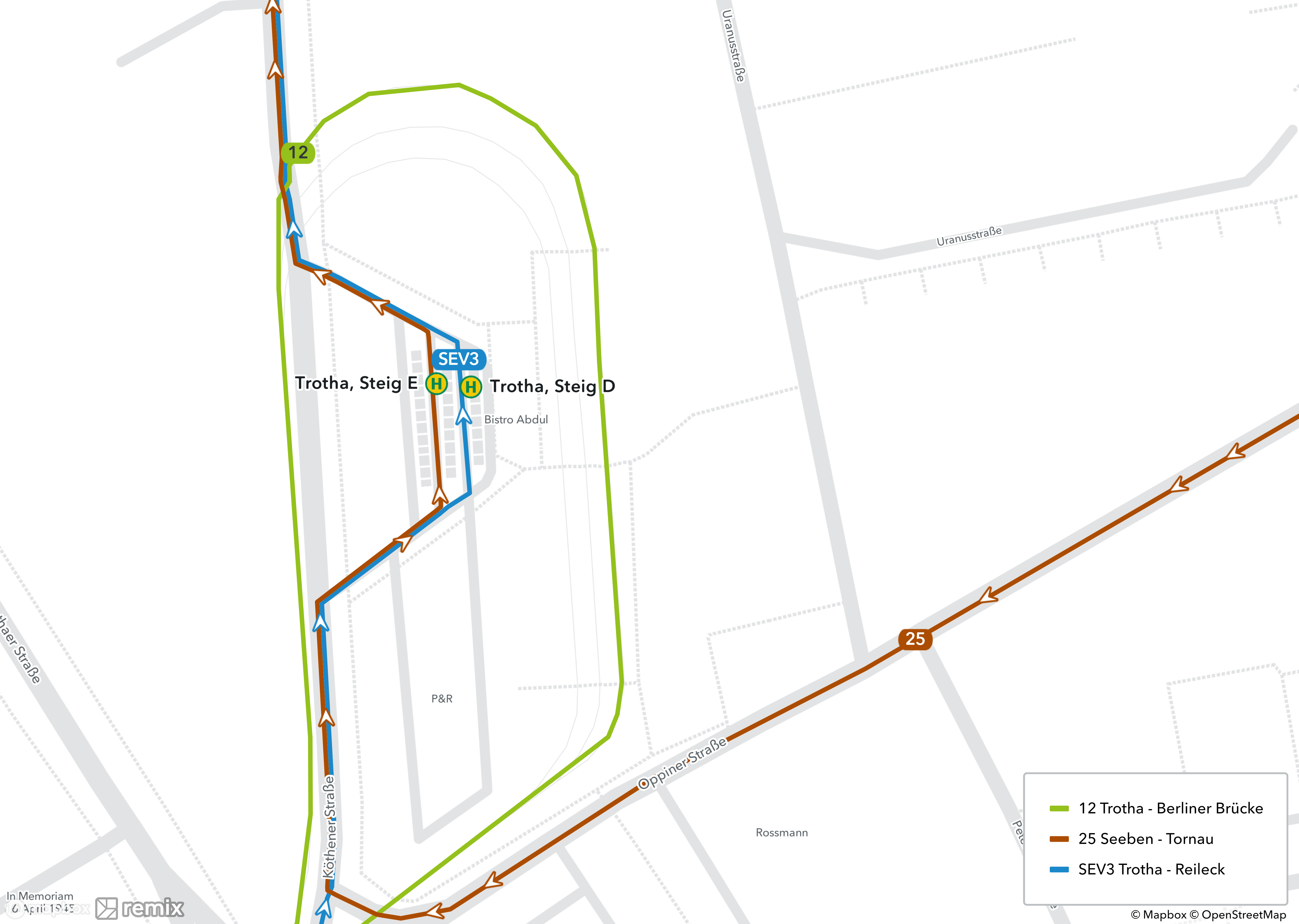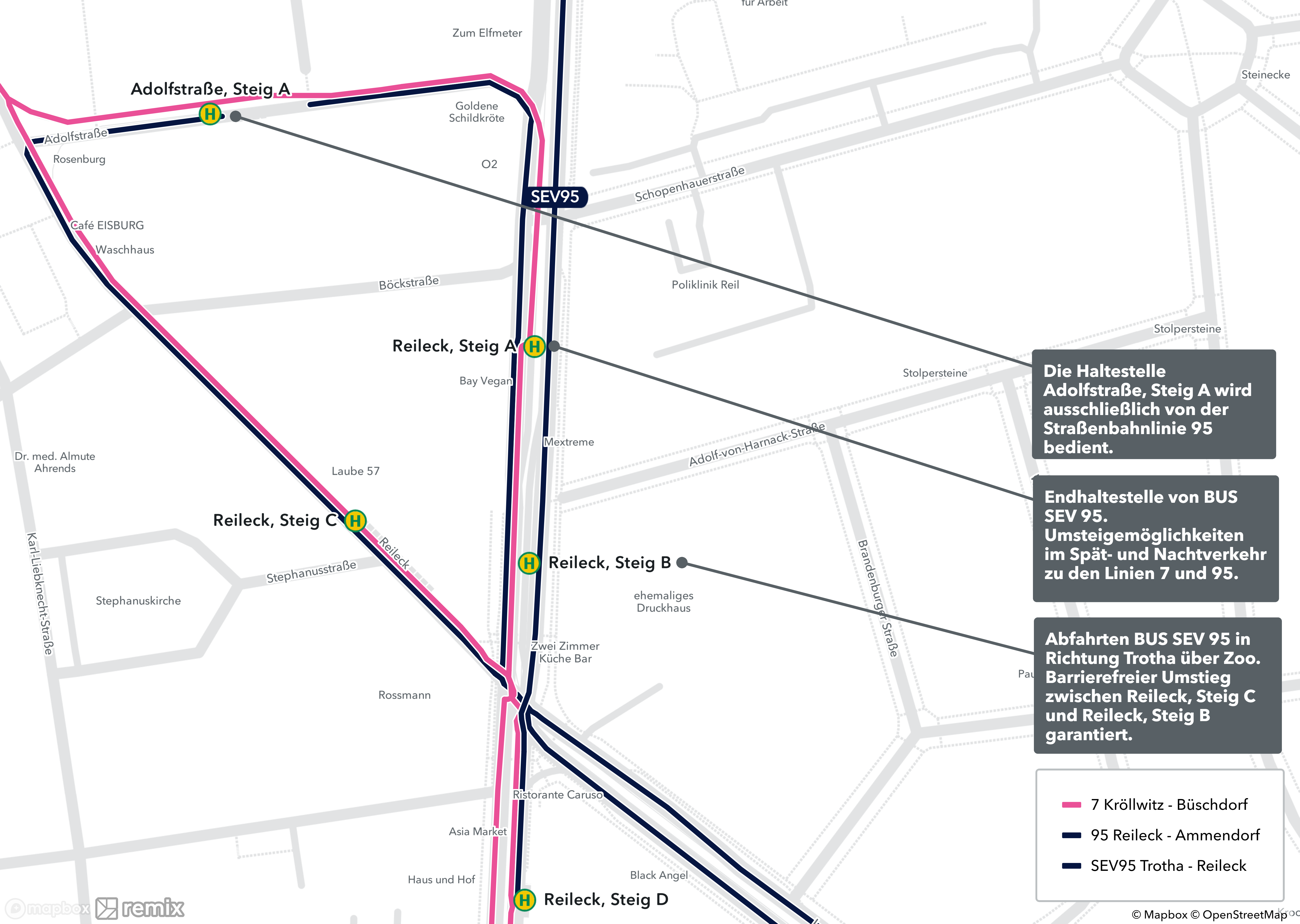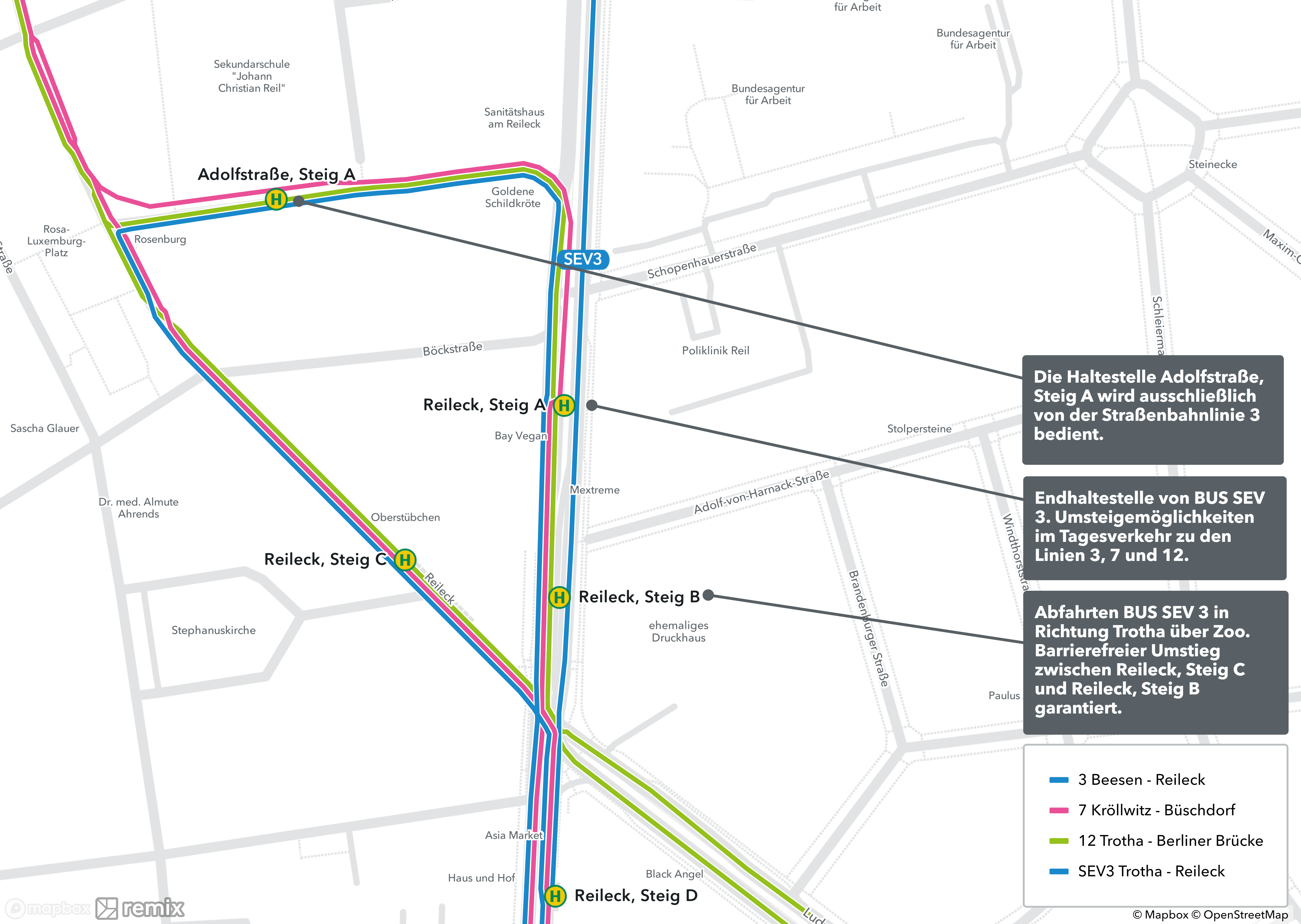 Die Gleisbauarbeiten finden von Freitag, 22. September 2023, 20 Uhr, bis Sonntag, 24. September 2023, bis Betriebsende, statt. Die Linie 3 fährt im genannten Zeitraum verkürzt nur bis zur Haltestelle Reileck, geänderte Fahrtzeiten sind notwendig. Die Linie 12 wird ab Reileck bzw. Seebener Straße über Triftstraße, Burg Giebichenstein und Am Klausberg umgeleitet. Linie 95 fährt verkürzt nur bis zur Haltestelle Reileck. Die erste verkürzte Fahrt ist am Freitag, 22. September 2023, von Ammendorf nach Trotha um 19.33 Uhr. Die letzte Fahrt ist am Freitag, 22. September 2023 von Trotha nach Ammendorf um 19.59 Uhr. Als Ersatz für die Linie 3 wird der Schienenersatzverkehr SEV 3 im Tagesverkehr eingesetzt. Im Spät- und Nachtverkehr wird der Schienenersatzverkehr SEV 95 als Ersatz für die Straßenbahnlinie 95 eingesetzt. Die Ersatzbuslinien SEV 3 und SEV 95 fahren von Reileck über Hegelstraße, Kurallee, Zoo, Seebener Straße und Pfarrstraße nach Trotha. Die Abfahrten am Reileck finden von Steig B statt. Die Abfahrten an der Haltestelle Trotha finden von Steig D statt. Da die Schienenersatzverkehre auf der Straßenbahntrasse verkehren, ist ein barrierefreier Aus- und Einstieg garantiert.