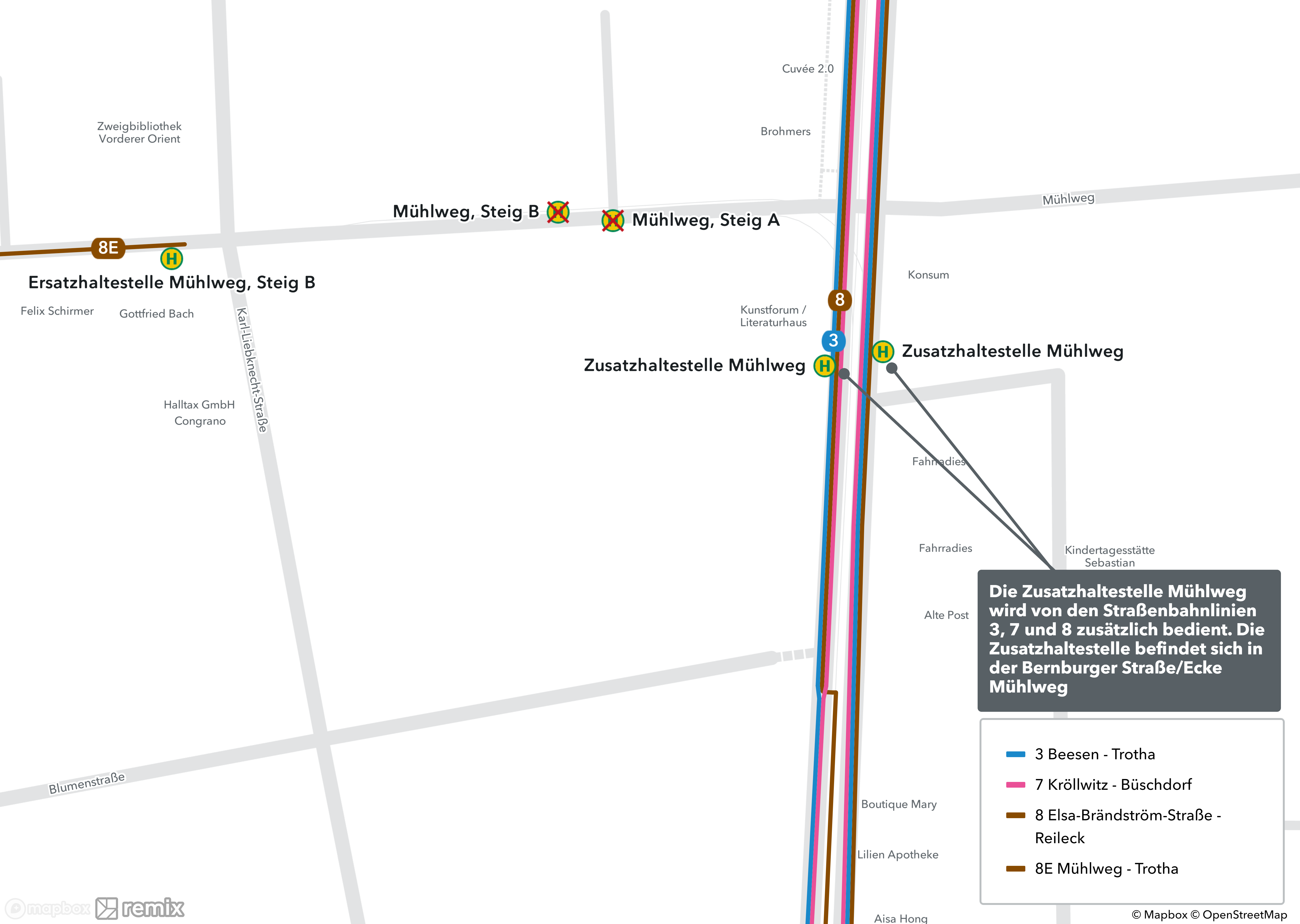 Die Gleisbauarbeiten finden von Montag, 25. September 2023 bis Freitag, den 29. September 2023, 16 Uhr, statt. Die Linie 8 erhält eine geänderte Linienführung: Elsa-Brändström-Straße, Vogelweide, Rannischer Platz, Marktplatz, Moritzburgring und Reileck. Die Linie 8E fährt als Ersatz von der Haltestelle ‚Mühlweg‘ beziehungsweise ‚Trotha‘ über Volkspark, Burg Giebichenstein, Am Klausberg und Seebener Straße. Es wird eine Ersatzhaltestelle „Mühlweg, Steig B“, im Mühlweg/Ecke Karl-Liebknecht-Straßen eingerichtet. Zudem wird eine nicht-barrierefreie Zusatzhaltestelle „Mühlweg“ in der Bernburger Straße/Ecke Mühlweg eingerichtet. Hier halten die Straßenbahnlinien 3, 7 und 8 ebenfalls. Beide Haltestellen sind fußläufig nach etwa 200 Metern bzw. zwei Minuten zu erreichen.