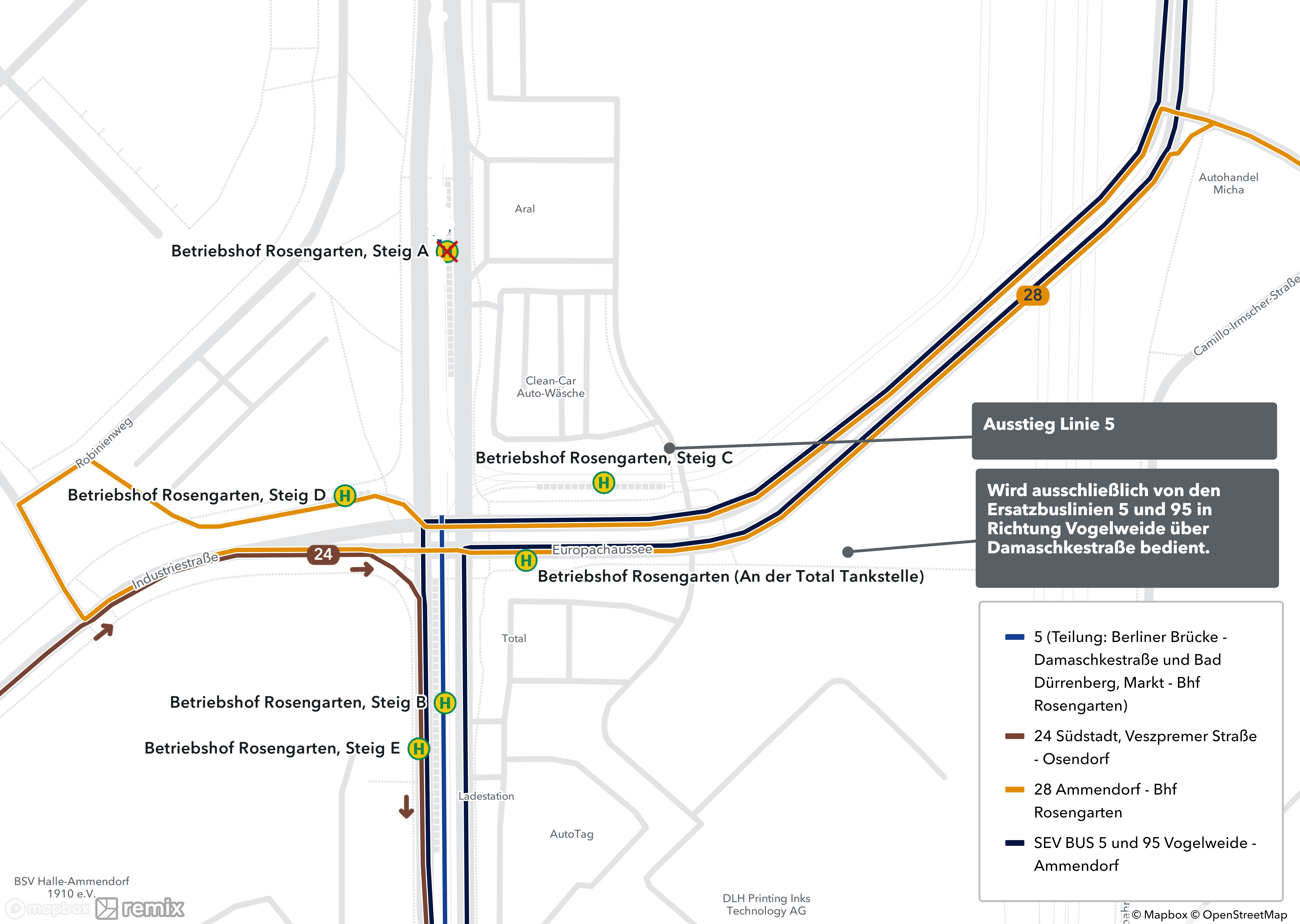 Als Ersatz für die Linien 5 und 95 fahren die Ersatzbuslinien 5 und 95 im Tages-, Spät- und Nachtverkehr zwischen den Haltestellen Vogelweide, Damaschkestraße und Ammendorf.