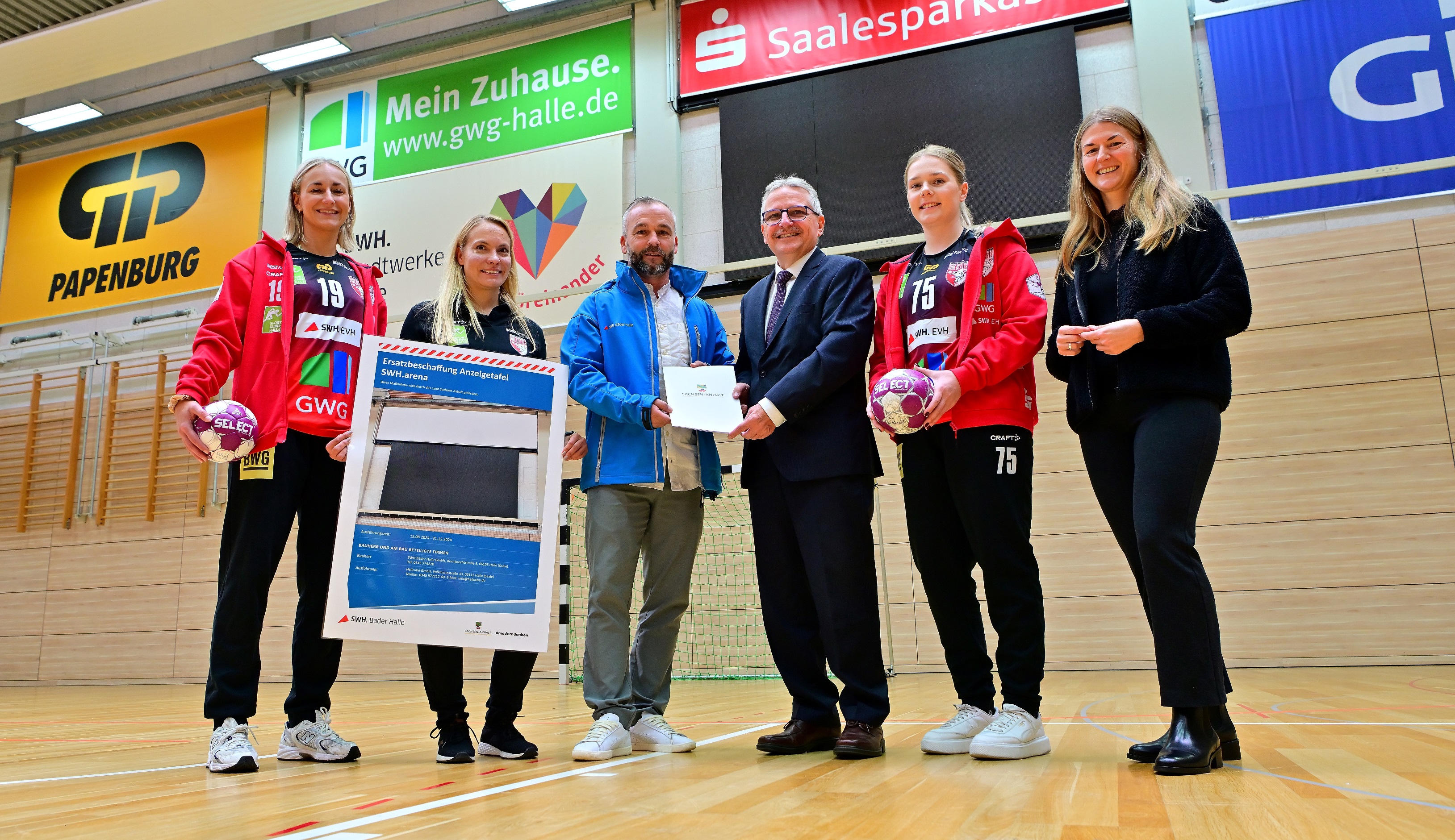 Heute übergab Klaus Zimmermann, Staatssekretär im Ministerium für Inneres und Sport des Landes Sachsen-Anhalt, einen Fördermittelbescheid an die Bäder Halle GmbH, ein Unternehmen der Stadtwerke Halle-Gruppe. Die Fördermittel dienen der ‚Ersatzbeschaffung einer Anzeigetafel für die SWH.arena‘. Die neue LED-Wand wird die veraltete Anzeigetafel ersetzen, die in der Vergangenheit mehrfach ausgefallen war. Die Maßnahme wird gefördert vom Land Sachsen-Anhalt.