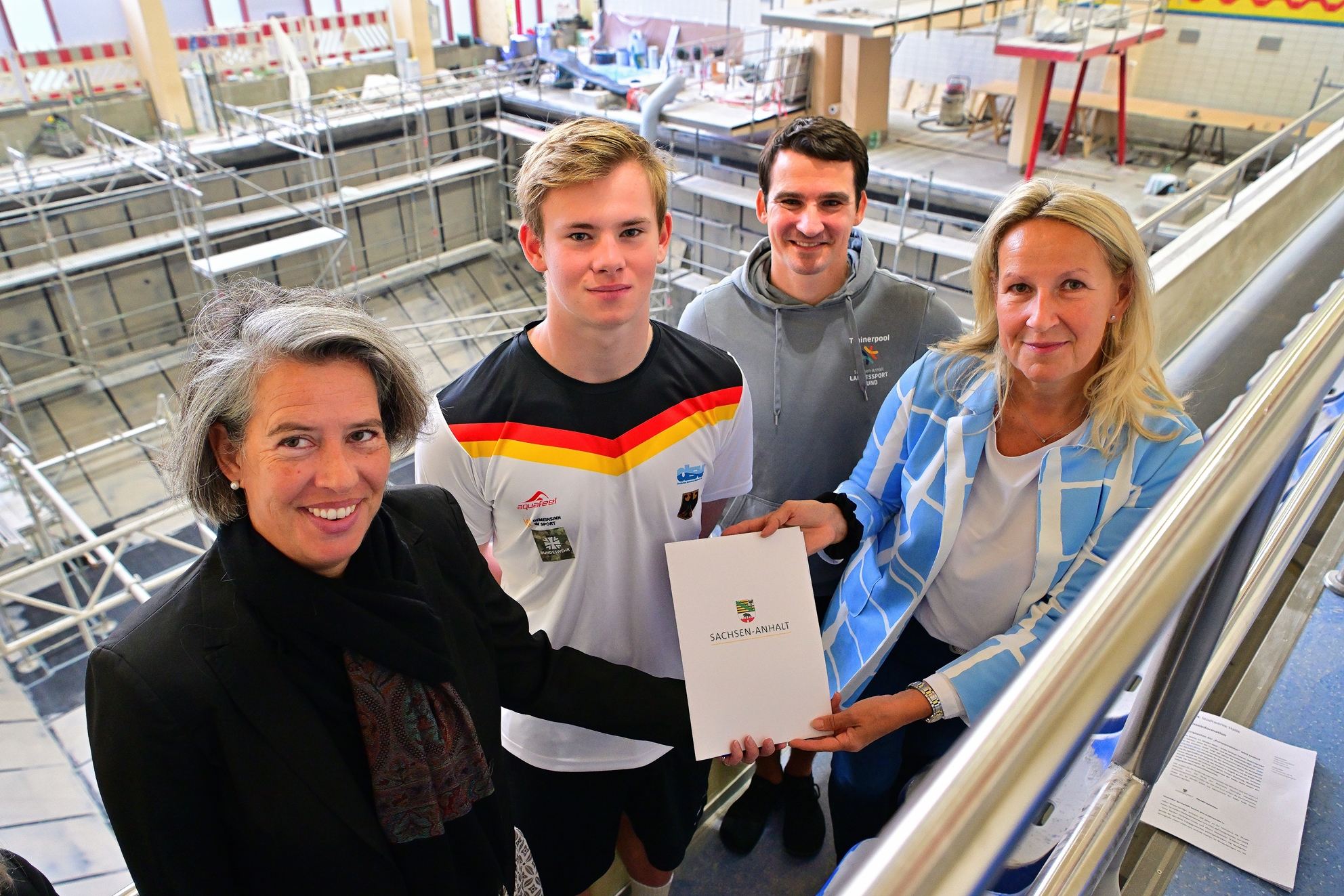 Große Sprünge können Wasserspringer nur machen, wenn die Trainings- und Wettkampfbedingungen stimmen. Und die stimmen. Dafür sorgt seit Jahren die Stadtwerketochter Bäder Halle GmbH (BHG). Um die exzellenten Voraussetzungen in der Sprunghalle der Neustädter Schwimmhalle für den Spitzensport weiter zu garantieren und die Sportstätte an moderne Standards anzupassen, hat die Bäder Halle GmbH aktuell die Sanierung des Beckens in Angriff genommen. Sachsen-Anhalts Ministerin für Inneres und Sport, Tamara Zieschang, überbrachte heute als Vertreterin der Landesregierung der Bäder Halle GmbH den entsprechenden Fördermittelbescheid.