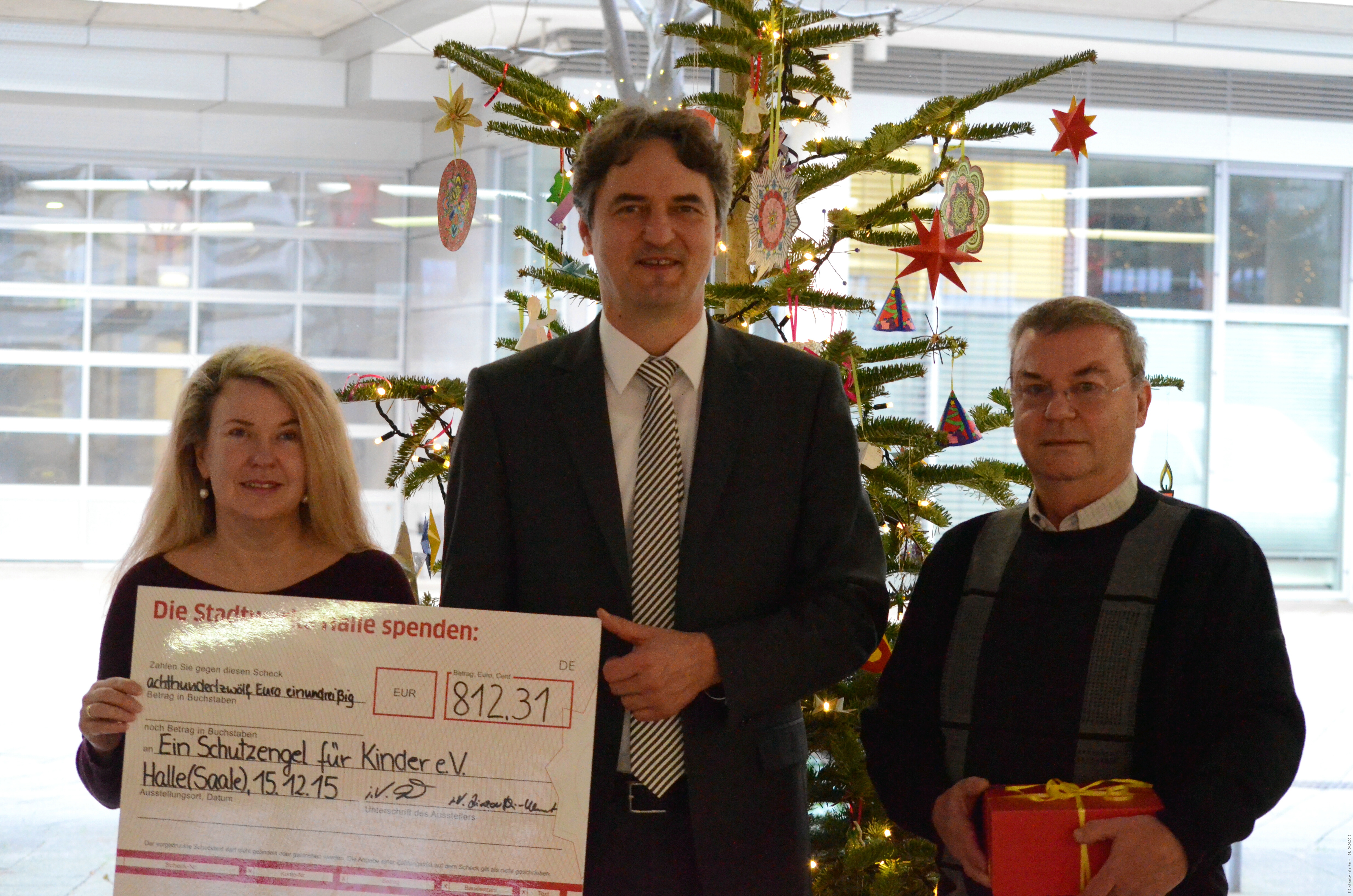 Heute überreichte Matthias Lux, Vorsitzender Geschäftsführer der Stadtwerke Halle GmbH, dem Verein im Kundencenter der Stadtwerke die Spende seiner Mitarbeiter in Höhe von 812,31 Euro. „Die Spende werden wir für eines unserer zahlreichen Projekte einsetzen“, erklärt Kerstin Sempert, Erste Vereinsvorsitzende des Vereins. „So haben wir es uns zur Aufgabe gemacht, benachteiligte Kinder und Jugendliche, die in Heimen leben müssen, durch personenbezogene Hilfe und zielgerichtete, Talentfördernde und integrative Projekte zu unterstützen. Wir vermitteln unter anderem Patenschaften, koordinieren Zeit- und Sachspenden für Kinder und Jugendliche, organisieren aber auch berufsfindende und kulturell bildende Maßnahmen wie Theater-, Museums-, Ausstellungs-, Kinobesuche.“ Näheres zu den zahlreichen Projekten des Vereins gibt es im Internet unter www.ein-schutzengel-für-kinder.de.