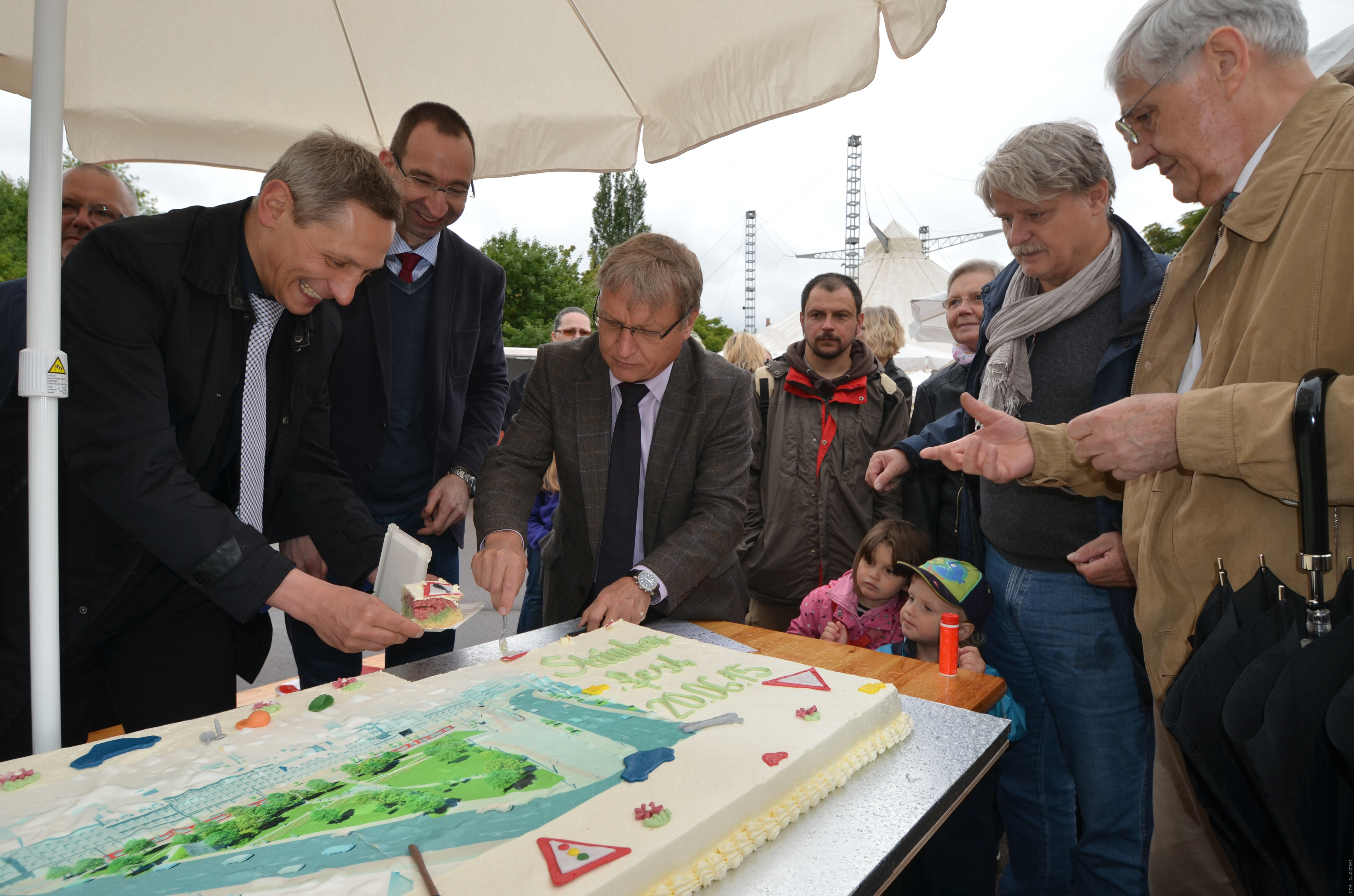 Zu dritt schnitten sie die von KATHI gebackene Steintor-Torte mit einem Zukunftsbild des zukünftigen Platzes an: HAVAG-Vorstand Vinzenz Schwarz (li.), Beigeordneter für Stadtentwicklung und Umwelt Uwe Stäglin (2.v.l.) und SWH-Geschäftsführer Prof. Dr. Matthias Krause (3.v.l.). Die Einnahmen werden für einen guten Zweck gespendet, nämlich Baumpatenschaften.