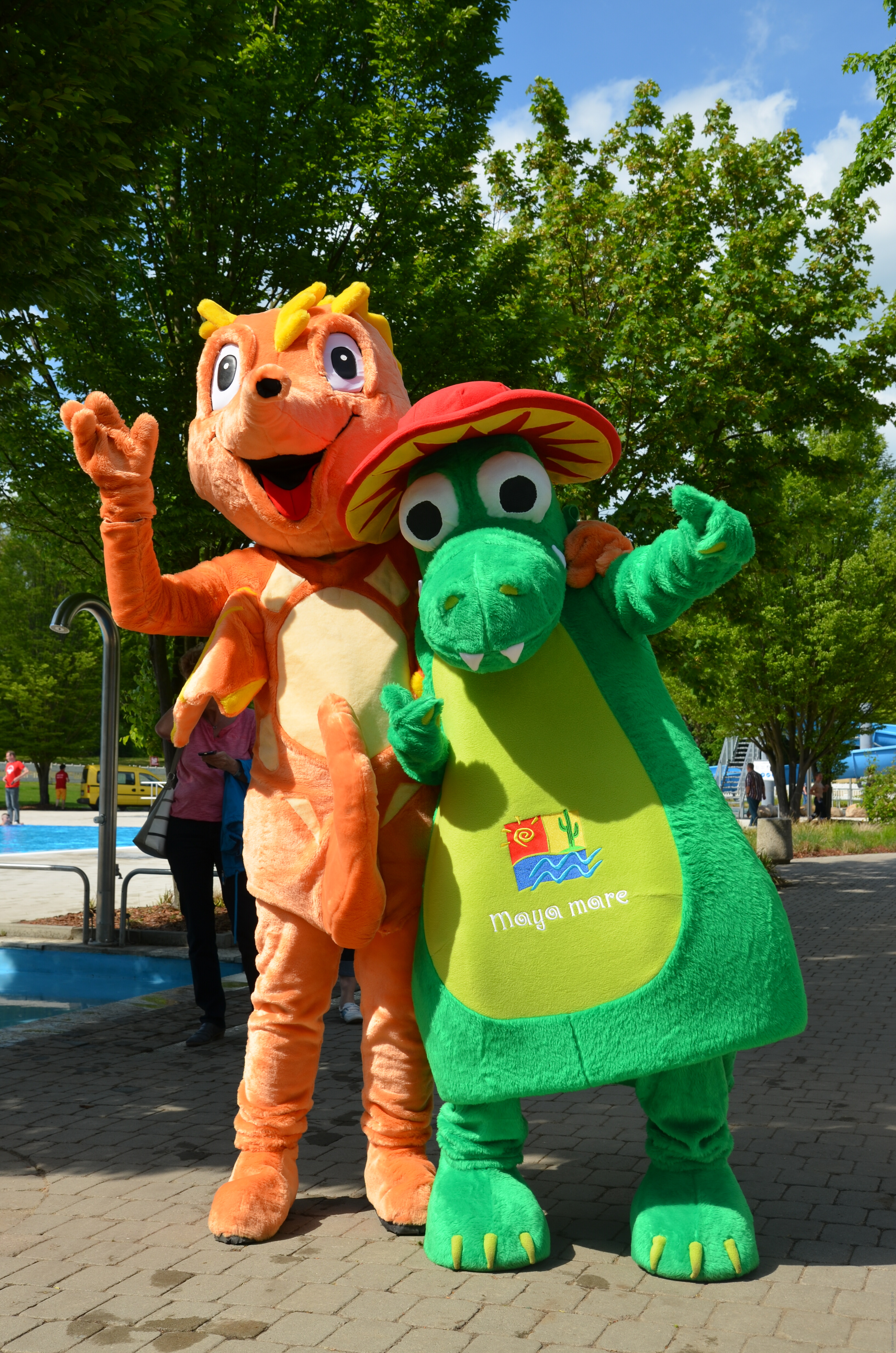 Seepferdchen SALLI, das Maskottchen der halleschen Freibäder (links) und Maya mare-Maskottchen MEX (rechts) im Freibad Saline.