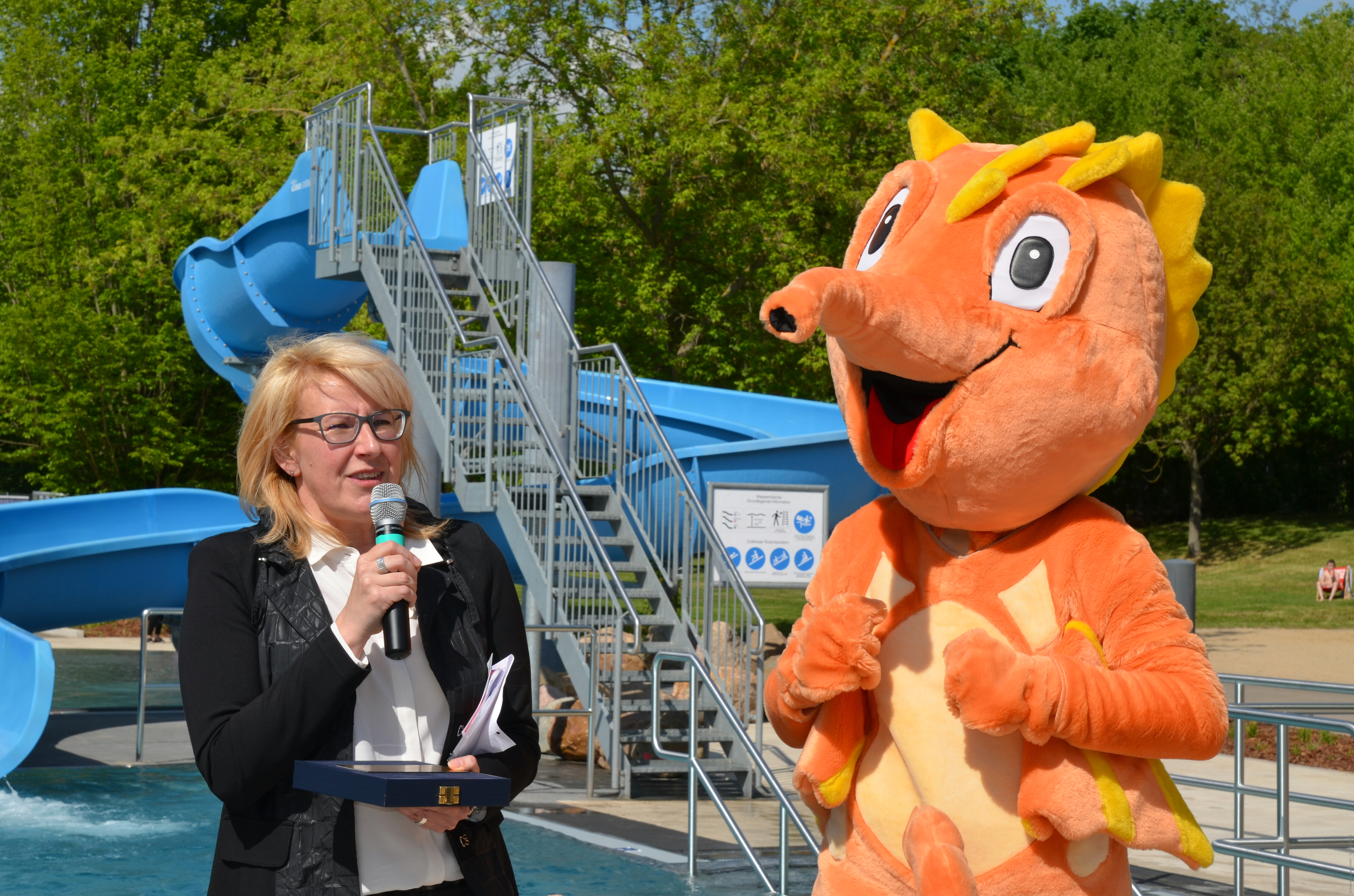 Geschäftsführerin des Maya mare und der Bäder Halle GmbH bei der Eröffnung des neuen Nichtschwimmerbeckens im Freibad Saline.