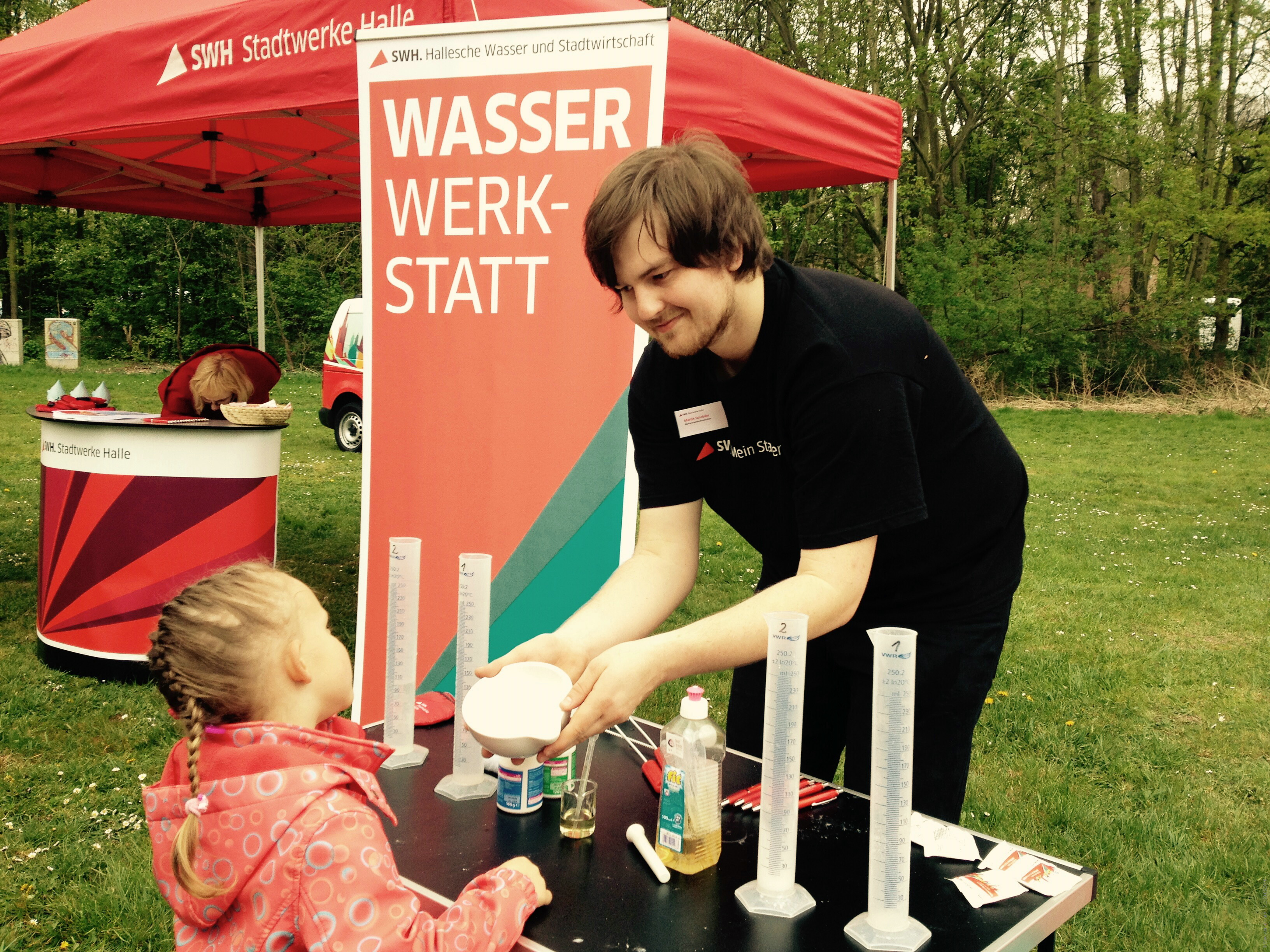 Wer statt nur zuhören lieber selber aktiv werden wollte, wurde im Stadtwerkedorf fündig: Beim Glücksrad animierten zahlreiche Preise dazu, selbst mal am Rad zu drehen. An den zehn Stationen der Wasserwerkstatt konnten insbesondere die kleinen Gäste mit dem halleschen Trinkwasser experimentierten. Und zur Abkühlung gab es ein Glas Wasser an der Trinkwasserbar.