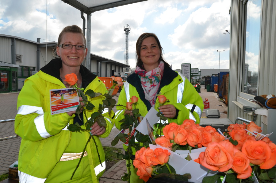 Unsere Wertstoffmärkte werden immer beliebter. Es kommen mehr und mehr Menschen, um ihre Wertstoffe bei uns zu entsorgen oder unser Verkaufsangebot zu nutzen. In den vergangenen 10 Jahren konnten wir unsere Leistung um 110 Prozent steigern“, sagt Uwe Langer, der von an Anfang an die Umgestaltung der Wertstoffmärkte mit verantwortete. „Als Dankeschön für ihre Treue schenken wir heute jedem Kunden eine Rose“.