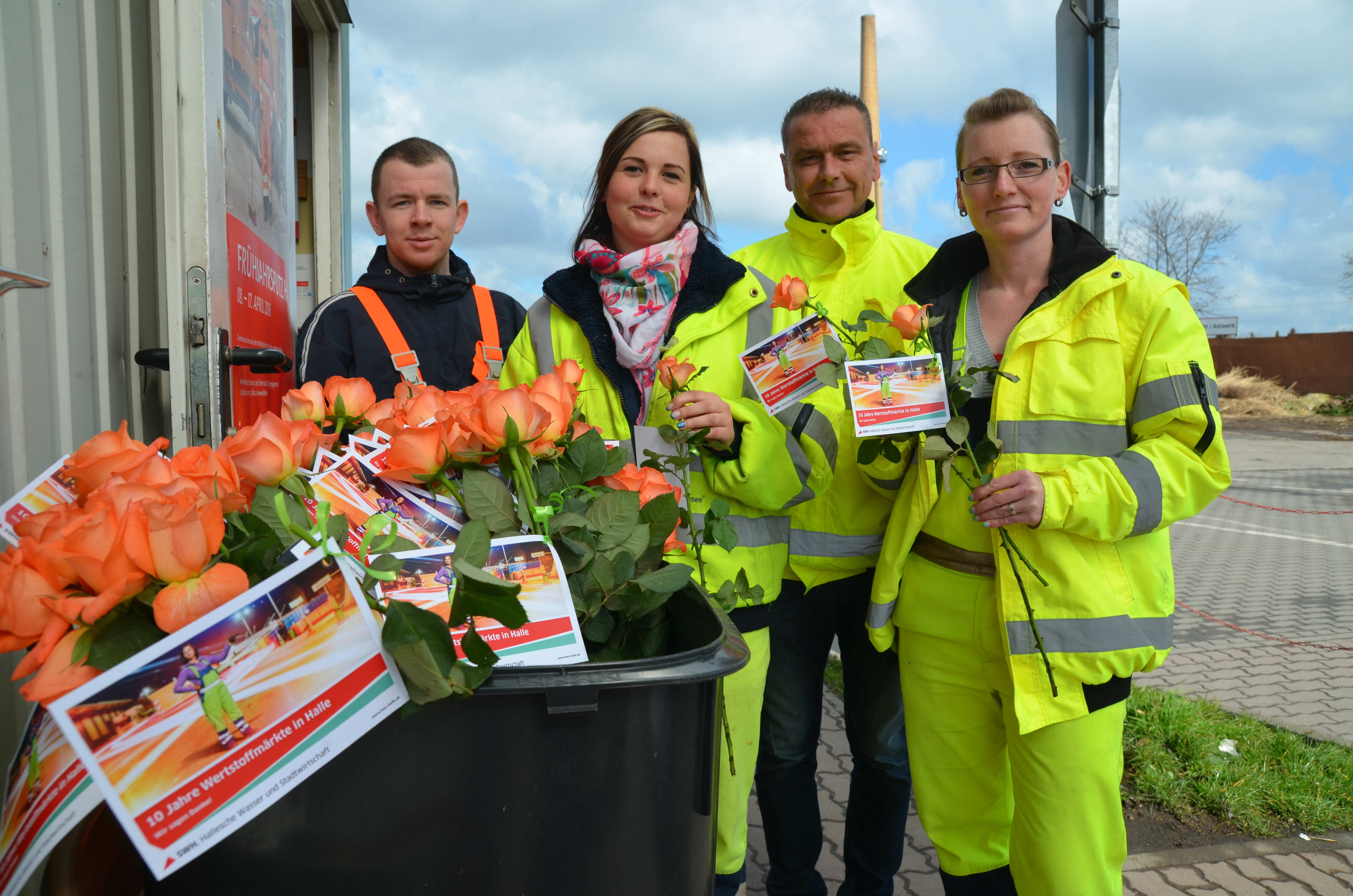 Eine Erfolgsgeschichte: 10 Jahre Wertstoffmärkte Halle / Eine Rose als Dankeschön für jeden Kunden