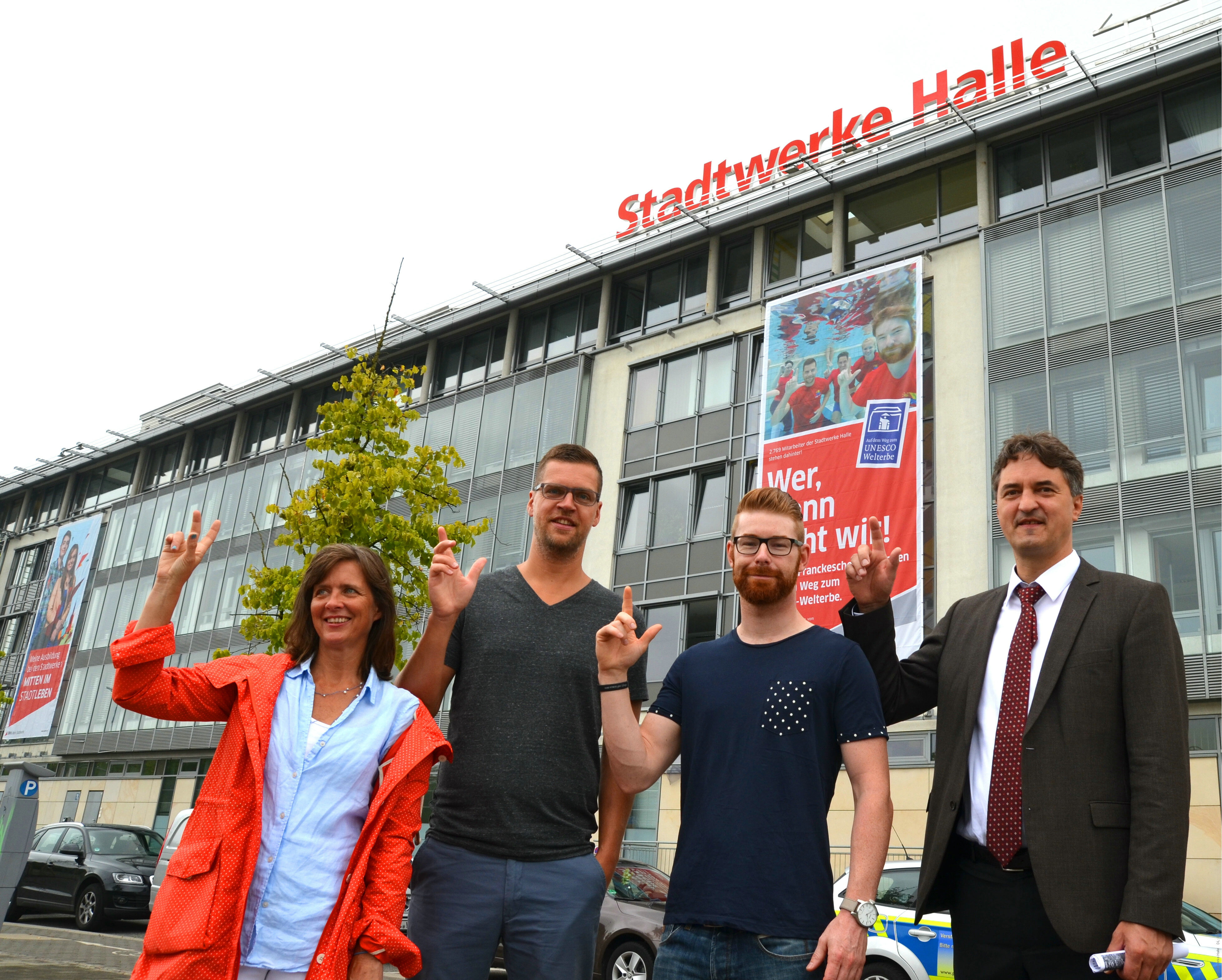 „Wer, wenn nicht wir“ 2.769 Mitarbeiter der Stadtwerke Halle-Gruppe stehen hinter der UNESCO-Bewerbung der Franckeschen Stiftungen. Sieben von ihnen ab heute auch ganz öffentlich. Über 80 Mitarbeiter der Stadtwerke beteiligten sich an einem unternehmens-internen Fotowettbewerb zum Thema Francke-Geste. Die sieben Mitarbeiter des Fitnessclubs Viva mare (im Maya mare) gewannen die Aktion und werben seit heute mit ihrem Unterwasser-Selfie mit der typischen Francke-Geste auf einem Riesenbanner am Stadtwerke-Gebäude an der Spitze für die Franckeschen Stiftungen.