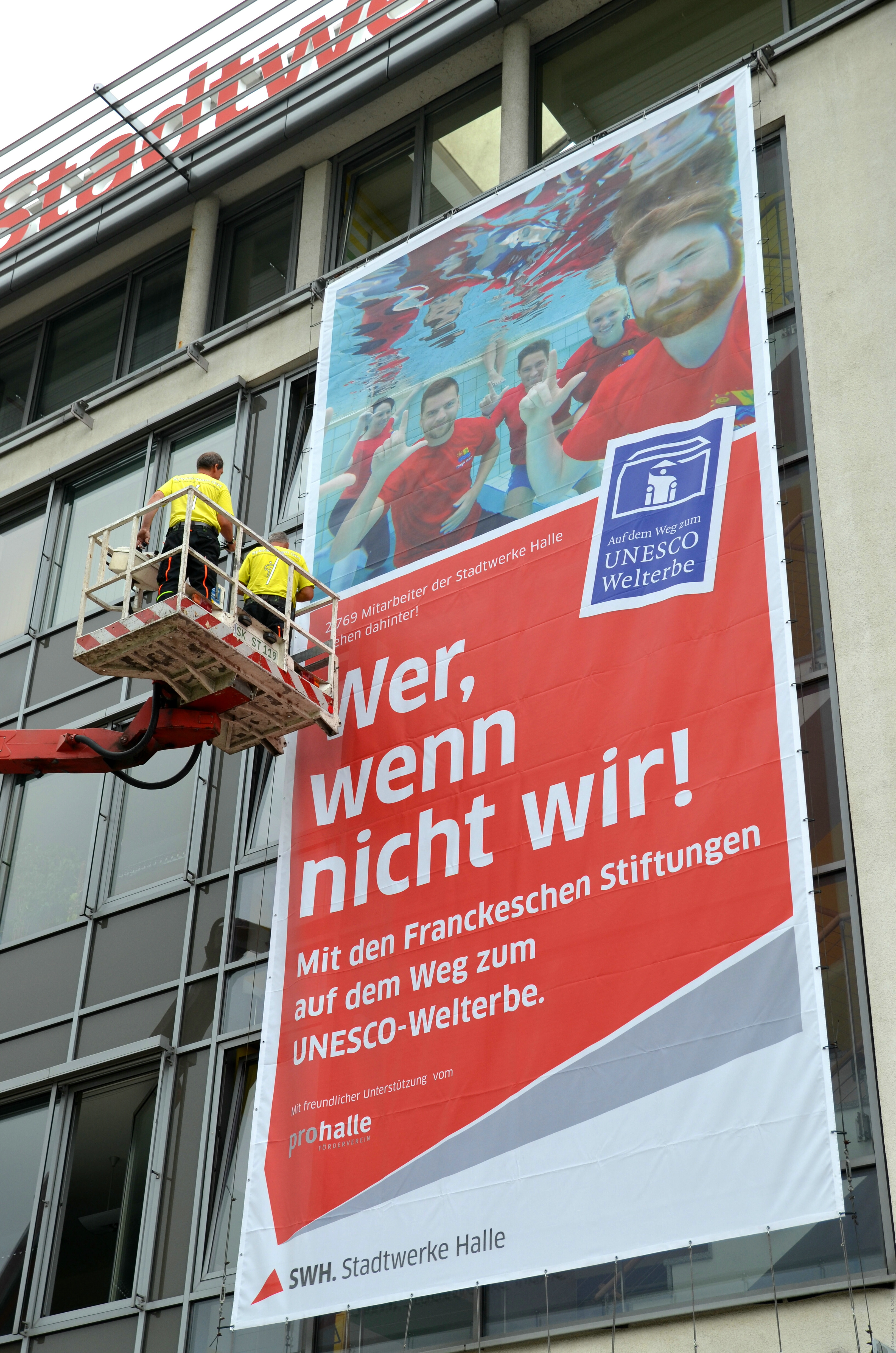 Das Riesenbanner wird ab heute bis Ende September das Stadtwerke-Gebäude Richtung Hochstraße und in Sichtweite der Franckeschen Stiftungen schmücken. Die endgültige Entscheidung, ob die Franckeschen Stiftungen als erstes Waisenhaus den Weltkulturerbe-Titel tragen dürfen, fällt im kommenden Juni. Die Stadtwerke Halle wünschen den Franckeschen Stiftungen viel Erfolg dabei!