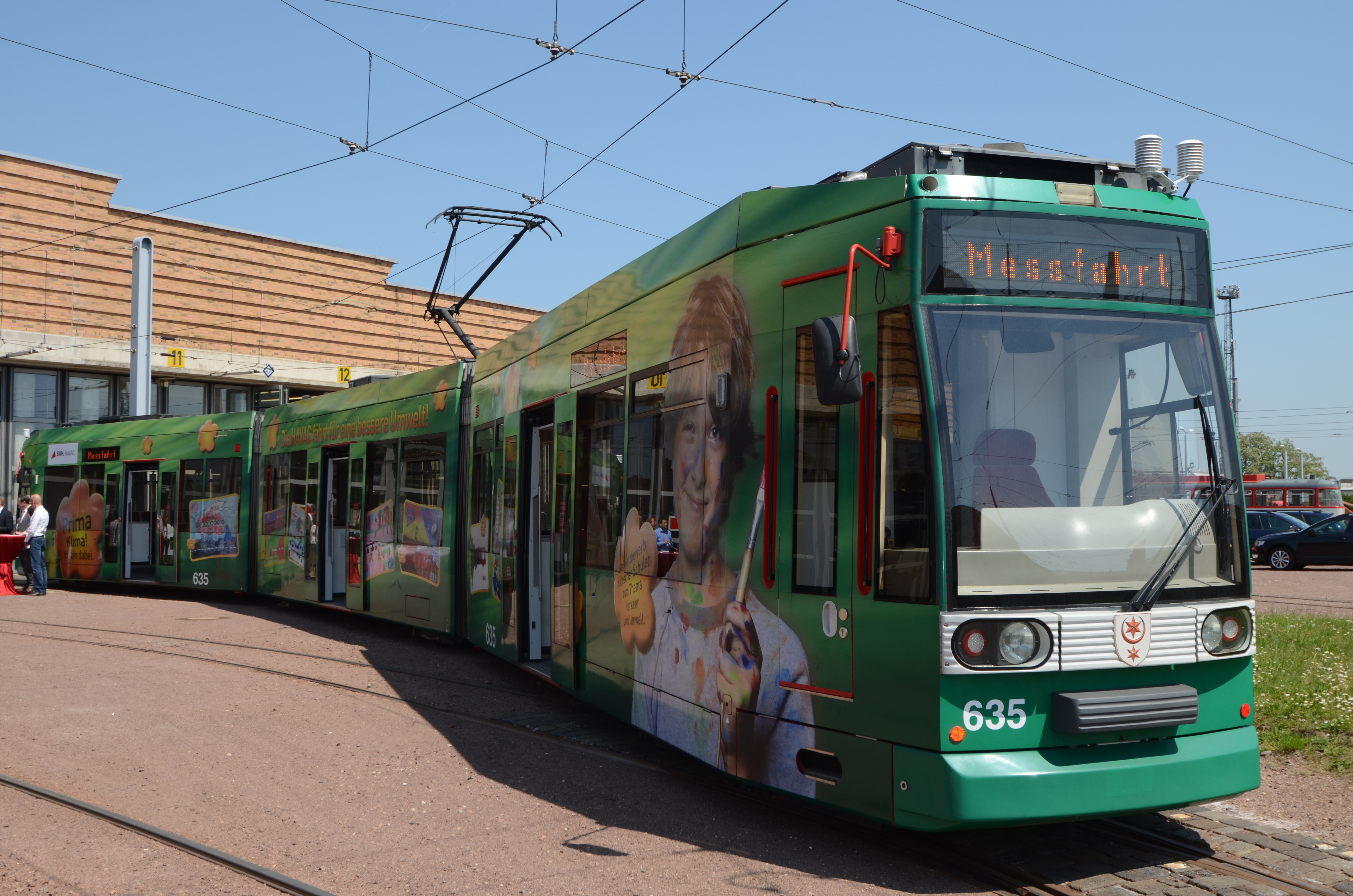 An ihren Messfühlern über der Fahrerkabine sind die drei Straßenbahnzüge der HAVAG zu erkennen, die seit Mai 2014 im Rahmen eines deutschlandweit bislang einmaligen Projektes im Einsatz sind.