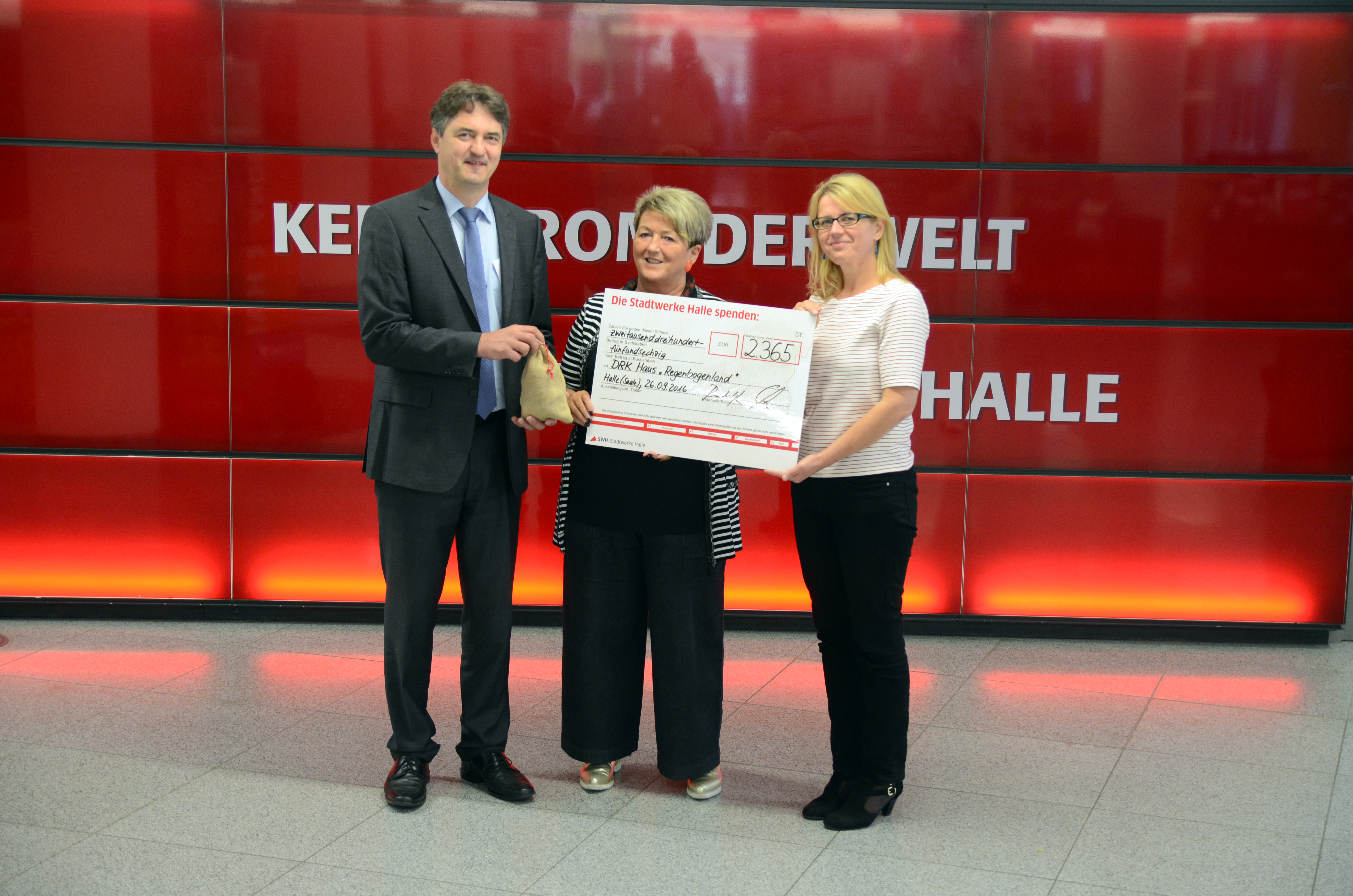 Halle (Saale), 26. September 2016 - Große Freude herrschte heute beim DRK Haus „Regenbogenland“, denn die Stadtwerke Halle übergaben der Kinder- und Jugendhilfeeinrichtung eine Spende in Höhe von 2.365 Euro. Die Einnahmen stammen aus einer Sammelaktion zum diesjährigen Laternenfest. Die Spende soll für die Pergola im großen Garten der Einrichtung sowie für neue Spielgeräte eingesetzt werden.