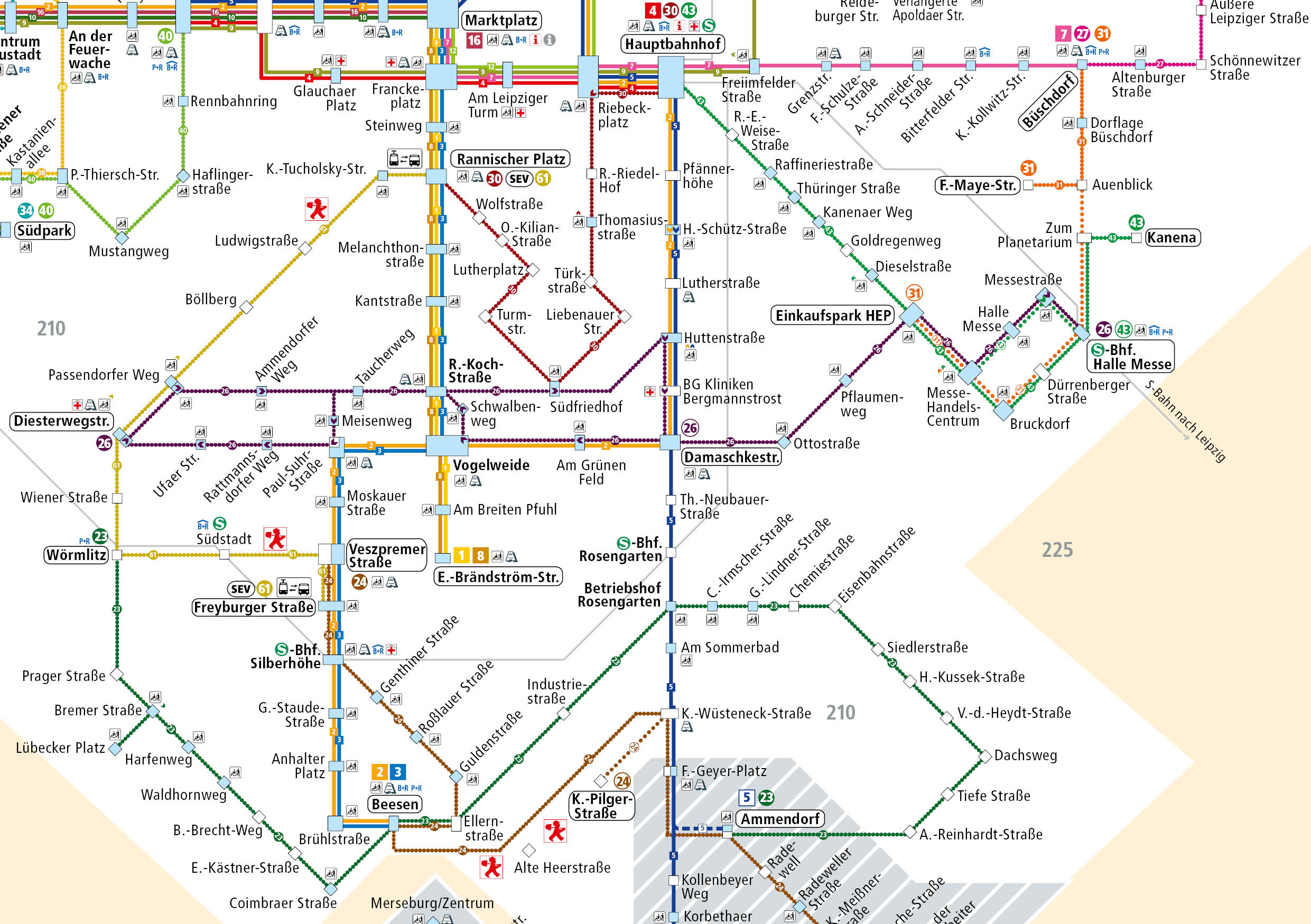 Unter Berücksichtigung des Nahverkehrsplans der Stadt Halle (Saale) werden die Haltestellen Dieselstraße, Goldregenweg, Kanenaer Weg nicht mehr bedient. Alternativ kann die Haltestelle Pflaumenweg mit den hier zukünftig verkehrenden Linien 26 und 43 genutzt werden.
