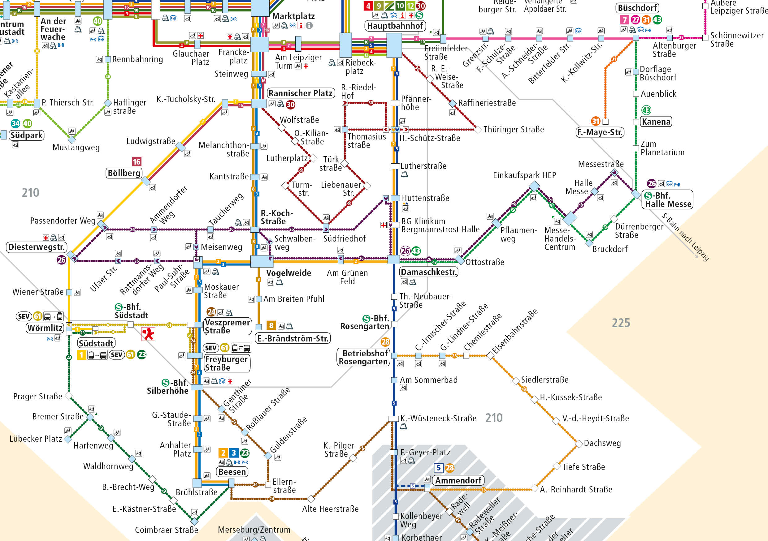 Die Anschlüsse TRAM/BUS werden verbessert, d.h. Warte- und Umsteigezeiten reduziert (Wörmlitz, Damaschkestraße, Ammendorf, Büschdorf). Der Schienenverkehr im Bereich Delitzscher Straße (Linie 7) und Merseburger Straße (Linien 2 + 5) wird gestärkt.