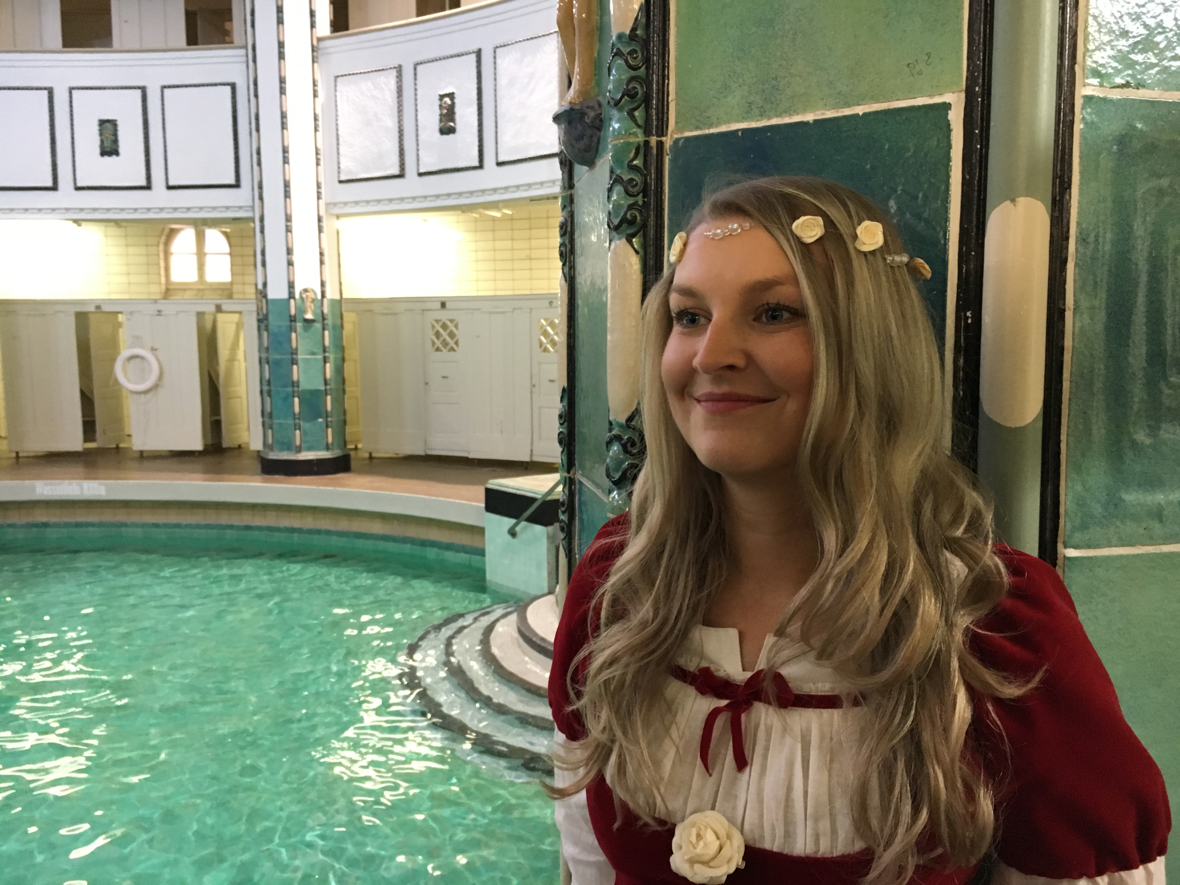 Dornröschen wirbt für die Stadtwerke-Aktion im historischen Stadtbad.
