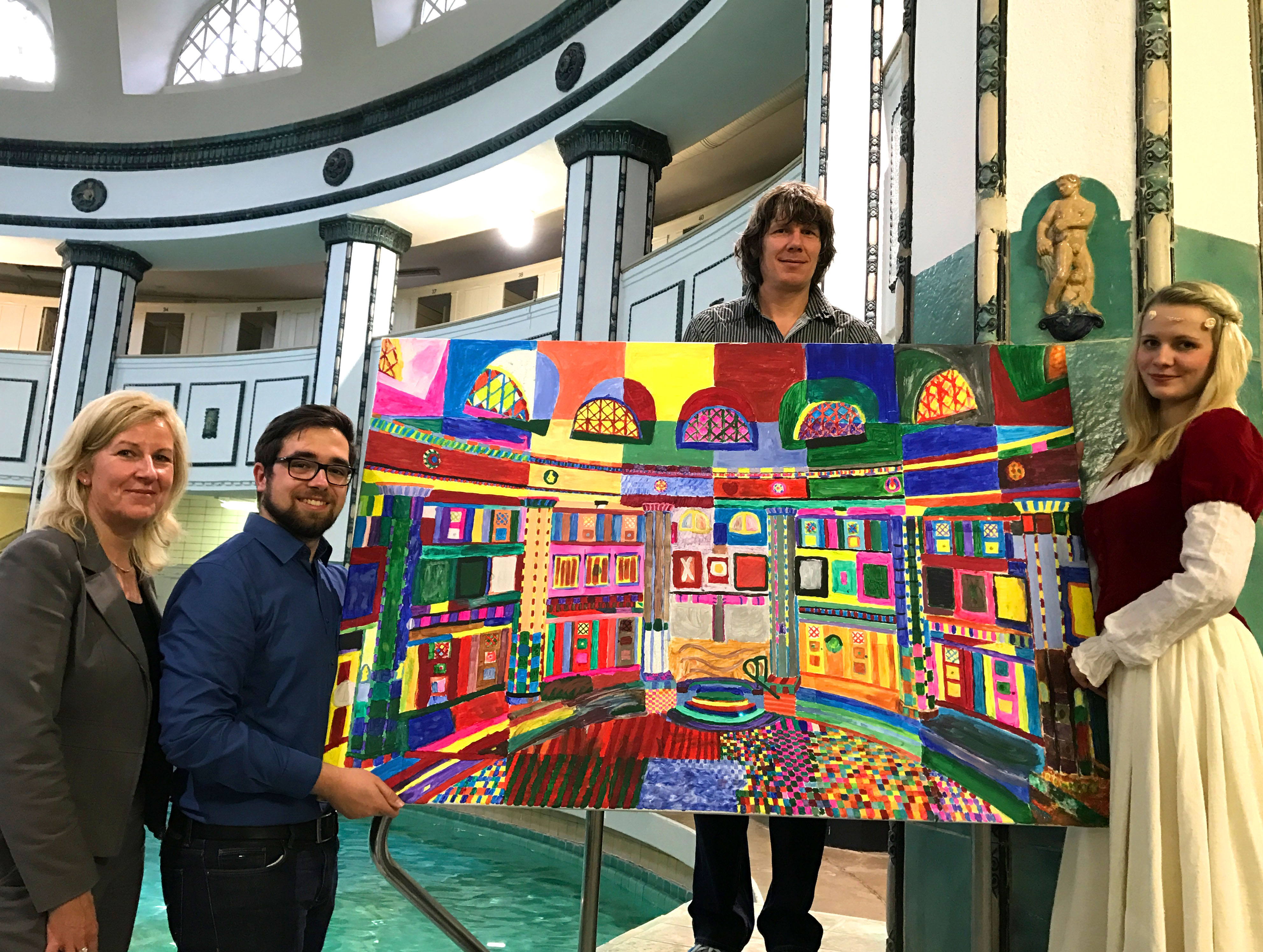 Unterstützer der Crowdfunding-Aktion: Bäder-Chefin Annette Waldenburger, Stadtrat Eric Eigendorf, Mitglied des Bäderbeirats Holger Friedrich und Dornröschen (v.l.n.r.). Die Leinwand wurde zum 100. Geburtstag des Stadbades von vielen, vielen Hallensern bemalt.