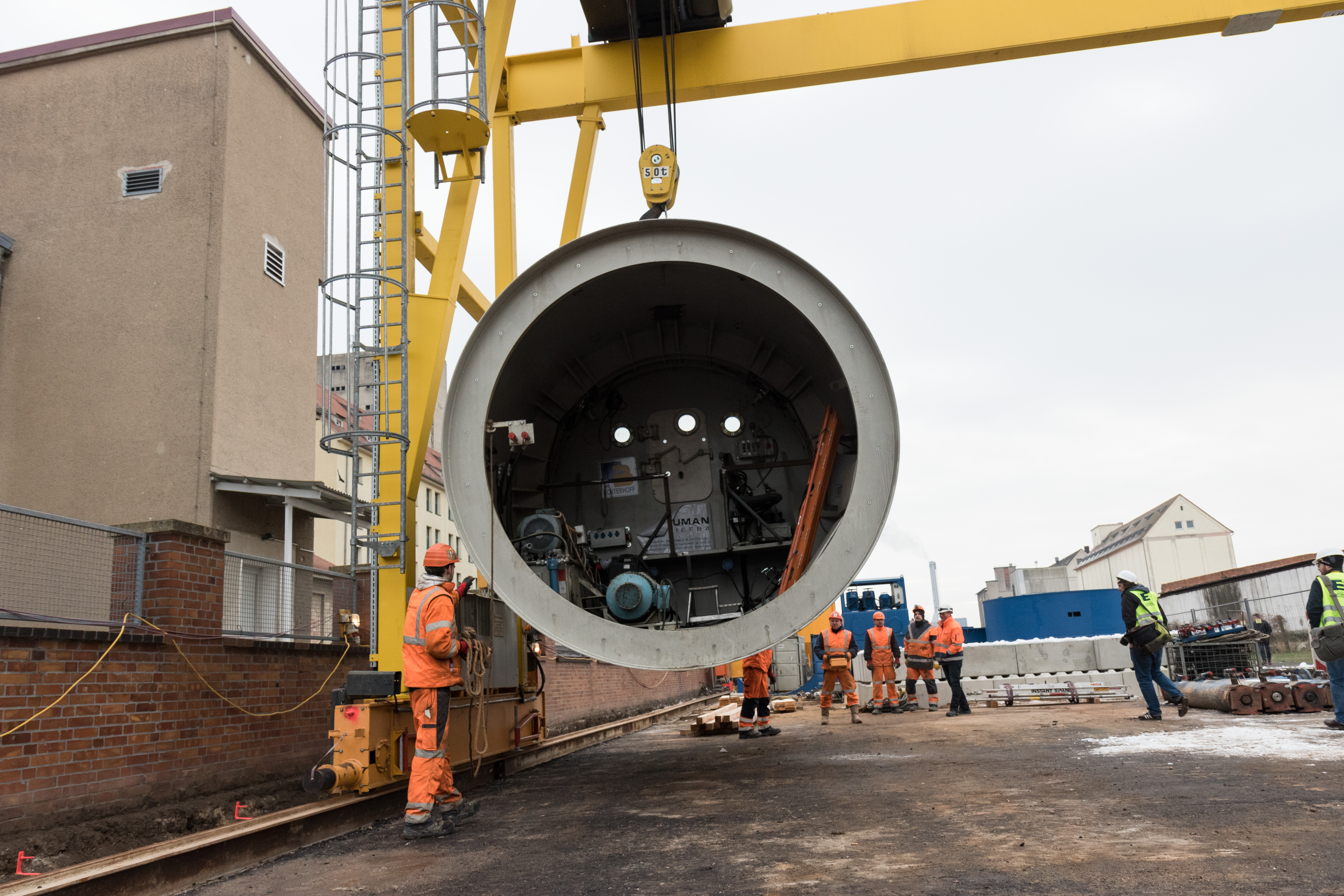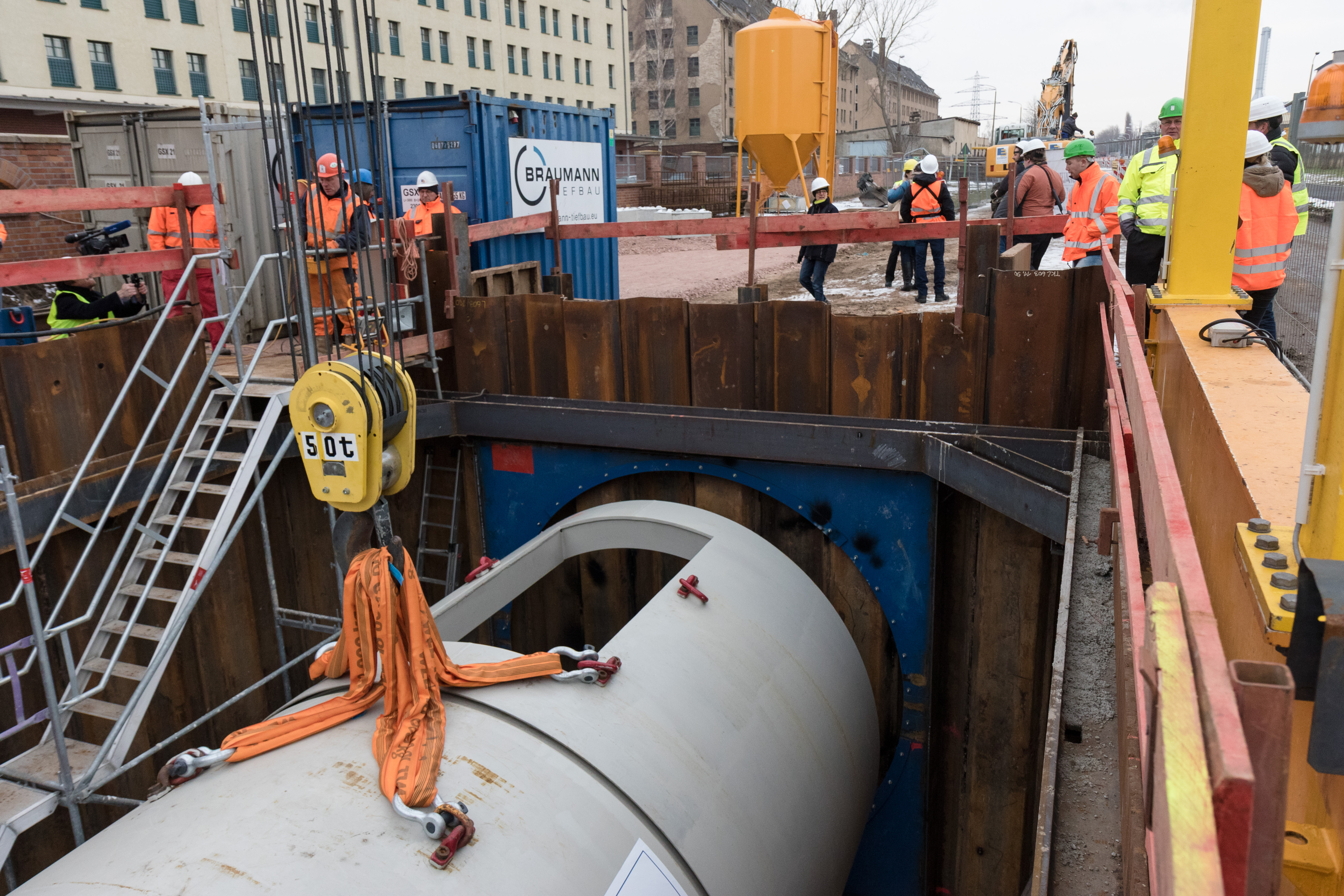 Halle (Saale), 11. Januar 2017 – Im Rahmen der Fluthilfe realisiert die Hallesche Wasser und Stadtwirtschaft GmbH (HWS), ein Unternehmen der Stadtwerke Halle, derzeit auf einer Länge von 1.259 Metern den Ersatzneubau des Abwasserhauptsammlers in der Brachwitzer Straße. Abschnitte des Sammlers zwischen Kraftwerk Trotha und Abwasserpumpwerk Tafelwerder waren beim Hochwasser 2013 durch Überflutung, Rückstau und Ausspülungen sehr stark beschädigt worden. Das Besondere am Bauverfahren: Genutzt wird ein „halboffener Vortrieb“, der mit einem Außendurchmesser von 3,60 Meter in der Größenordnung bis dato einzigartig in Deutschland ist. Heute wurde die große Vortriebsmaschine in die Baugrube eingehoben. Die Baumaßnahme begann im September 2016 und soll im Oktober 2017 abgeschlossen sein.