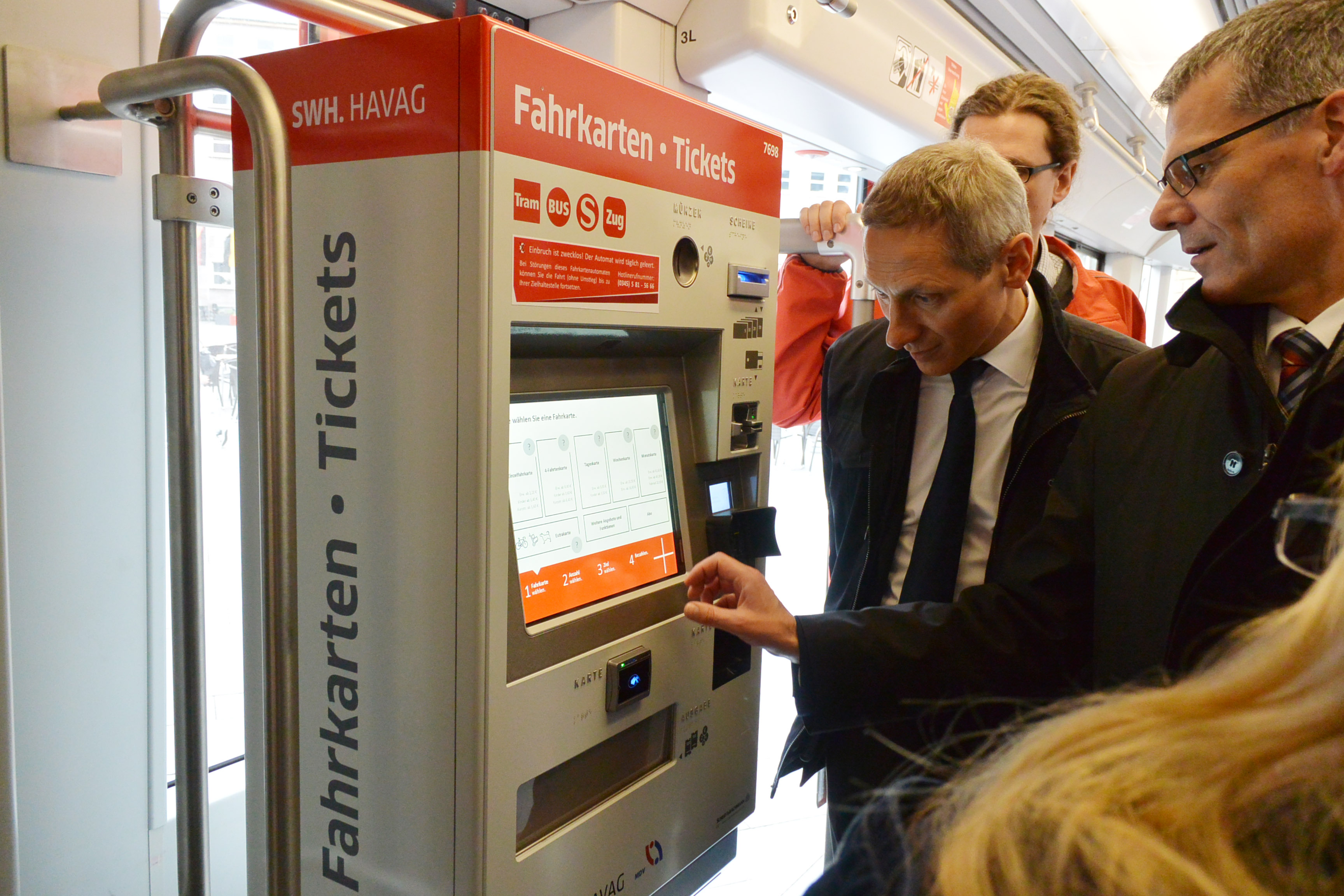 „Im Zuge der Umstellung haben wir die Bedienerführung überdacht: Sie wird einfach, intuitiv und nach Ende der Einführungsphase zweisprachig sein: deutsch und englisch. Ich danke unseren versierten Fachingenieuren, die all ihr Know-how in die technische Entwicklung der Automaten und der Montage stecken und gut vorankommen, so dass wir heute den 50. Automaten präsentieren können“, betont HAVAG-Vorstand Vinzenz Schwarz. „Mit vielen erfolgreichen Kundenaktionen, der heutigen und vorangegangenen in Halle, Merseburg, Bad Dürrenberg, wollen wir vor allem Berührungsängste abbauen. Inzwischen wurden an den neuen mobilen Automaten bereits rund 12.000 Tickets verkauft, wir erwarten einen weiteren Anstieg.“