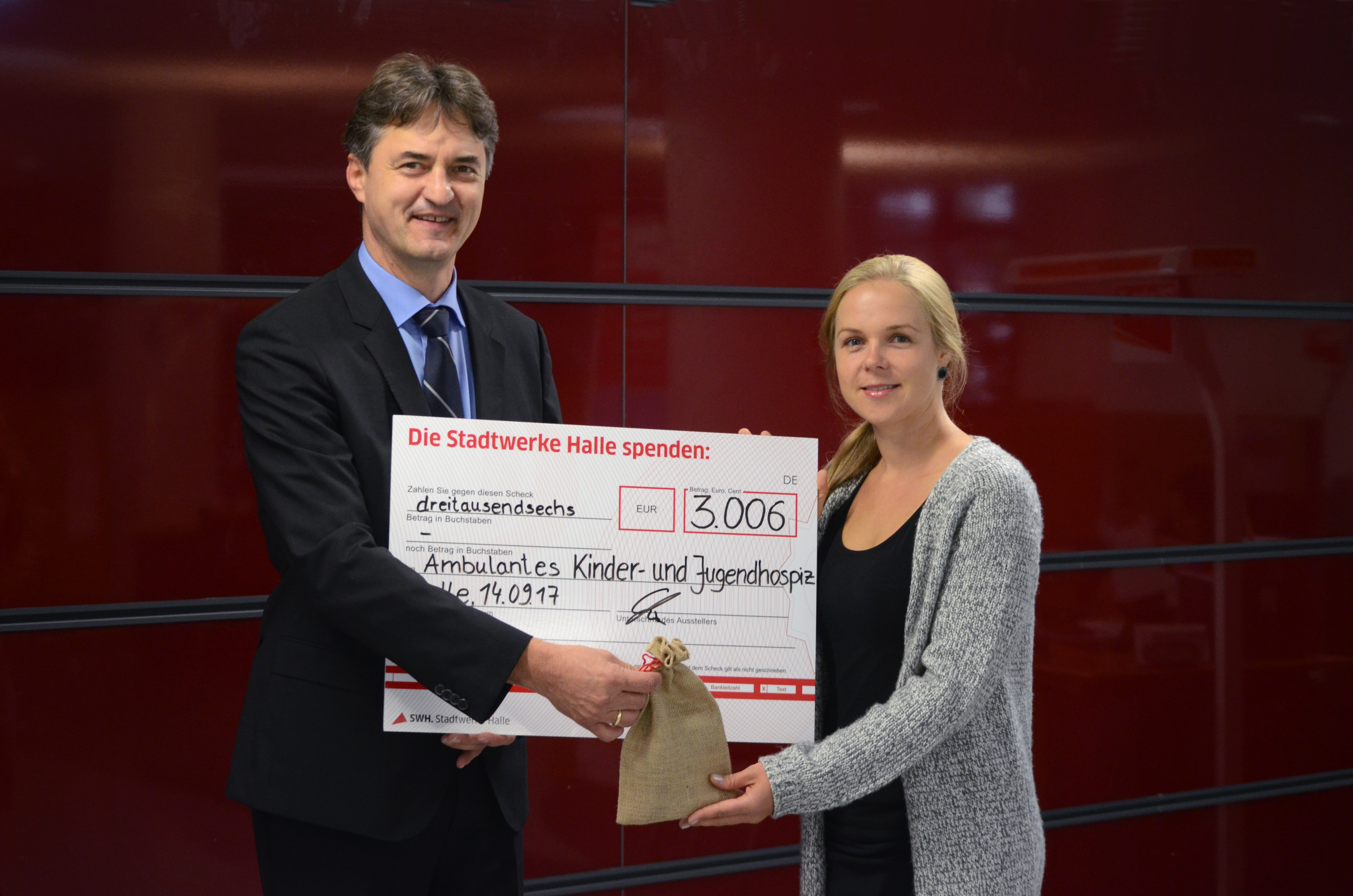 Große Freude herrschte heute beim Ambulanten Kinder – und Jugendhospiz, denn Matthias Lux, Vorsitzender Geschäftsführer der Stadtwerke Halle GmbH, übergab Kareen Friedrich vom Hospiz im Kundencenter der Stadtwerke eine Spende in Höhe von 3.006 Euro. Die Einnahmen stammen aus einer Sammelaktion zum diesjährigen Laternenfest. „Wir sind gerührt und werden die Spende für unsere laufende Hospizarbeit einsetzen, denn wenn Kinder von Sterben und Tod betroffen sind, benötigen sie und ihre Angehörigen besondere Aufmerksamkeit und Unterstützung, die wir ihnen geben können“, sagt Kareen Friedrich.