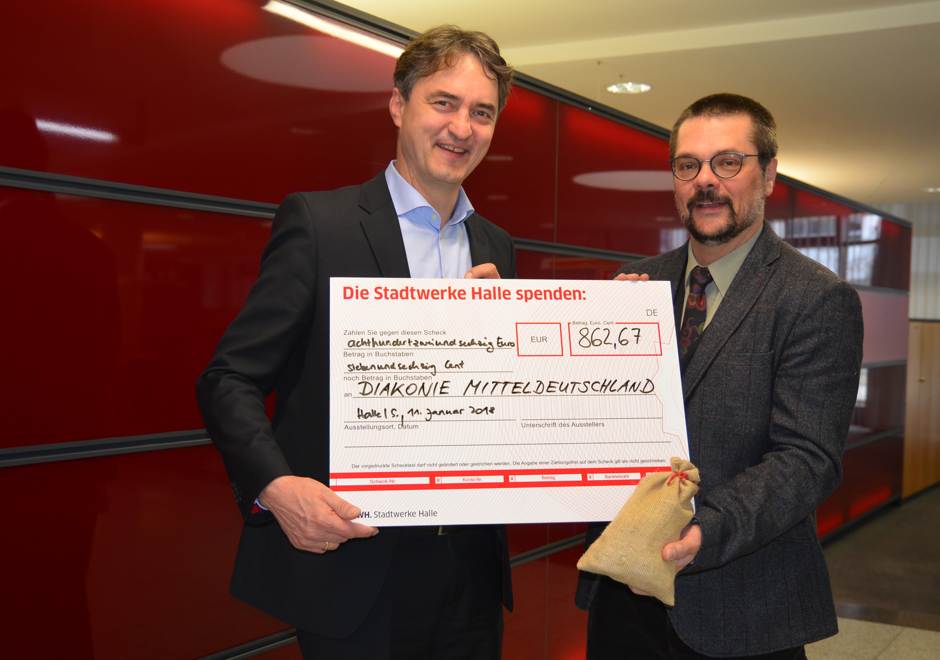 Die Stadtwerke-Mitarbeiter bewiesen in der Vorweihnachtszeit im Rahmen einer betrieblichen Weihnachtsfeier ein großes Herz und sammelten Spendengelder für die Aktion „Kindern Urlaub schenken“ der Diakonie Mitteldeutschland. Heute überreichte Matthias Lux, Vorsitzender Geschäftsführer der Stadtwerke Halle GmbH, die Spende seiner Mitarbeiter in Höhe von insgesamt 862,67 Euro an die Diakonie Mitteldeutschland.