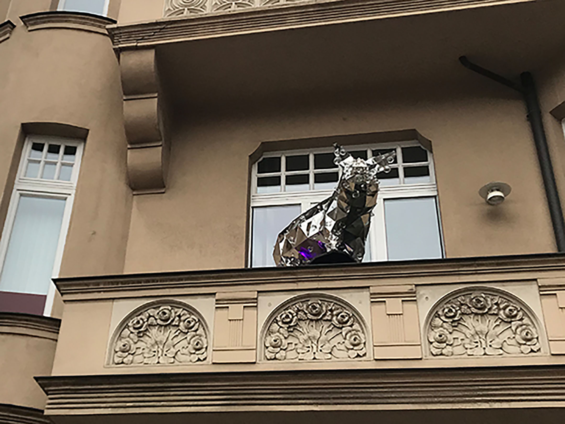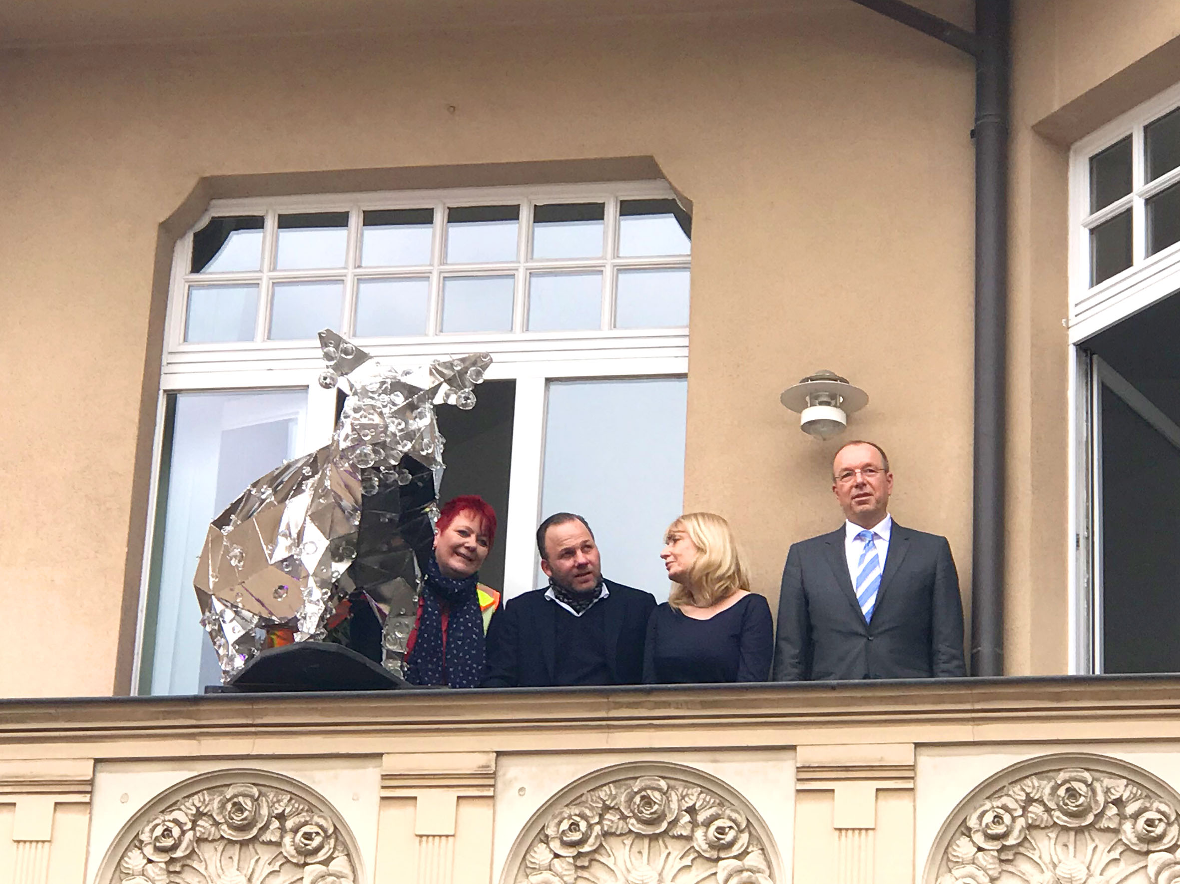 Glitzernde Attraktion für den „Kreativdialog“ des STADTBAHN-Programms Halle in der Großen Steinstraße: Als erstes Kunstobjekt ist das „Glitzerschwein“ unter Beisein des halleschen Künstlers Marc Fromm auf dem Balkon der Kanzlei Foppe/Raabe am Joliot-Curie-Platz enthüllt worden. Ab sofort kann das 30 Kilogramm schwere, 1,70 Meter lange und 1,00 Meter hohe Kunstobjekt bewundert werden. Die Figur ist ein kleineres Abbild des Glitzerschweins, welches seit 2017 im Finanzamt Halle installiert ist und Bezug auf eine hallesche Saga zur Salzentdeckung nimmt.