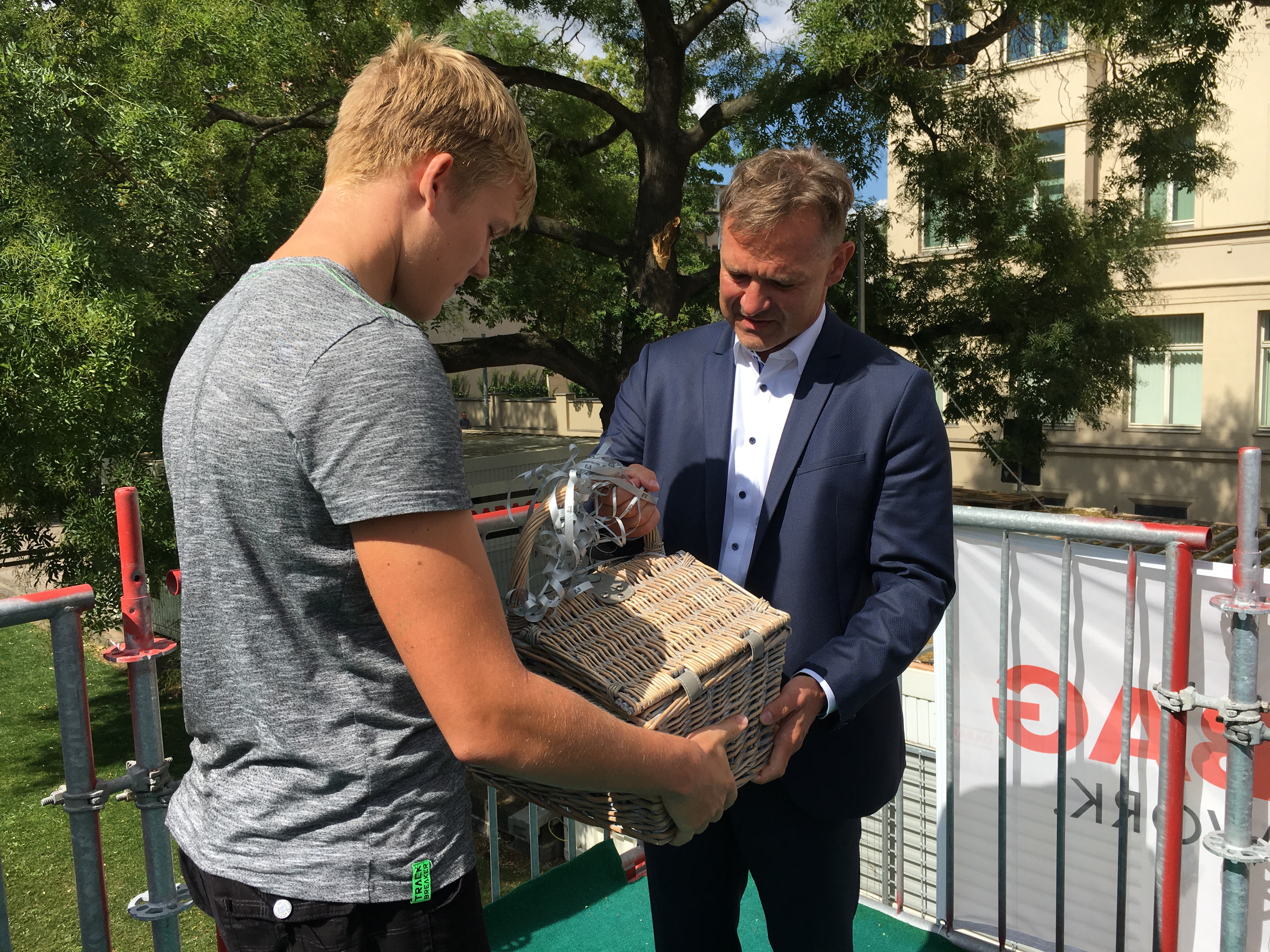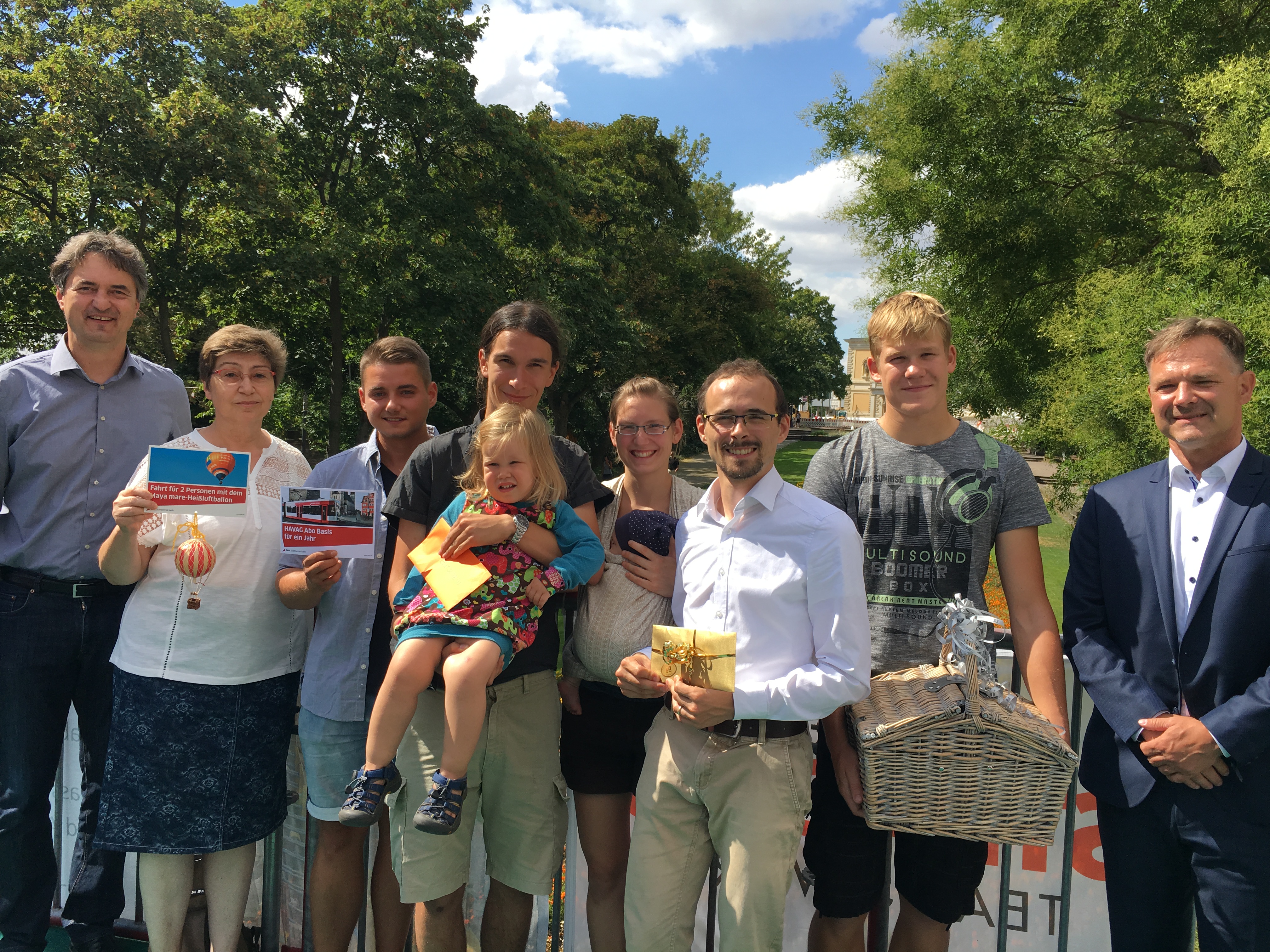 Heute überreichten Stadtwerke-Geschäftsführer Matthias Lux und Jan Röder, Vorstand der Volksbank AG, den fünf Preisträgern des Gewinnspiels zum Baustellenfest in der Großen Steinstraße ihre Gewinne. Das Fest hatten die Stadtwerke Halle gemeinsam mit der Volksbank AG und dem Zirkus Klatschmohn Anfang Juli mitten auf der Baustelle veranstaltet, der Zulauf war mit rund 1.500 Besuchern groß. Verlost wurden eine Heißluftballonfahrt, ein HAVAG-Jahresabo, 5 Gramm Gold, ein Maya mare-Gutschein und ein Picknickkorb.