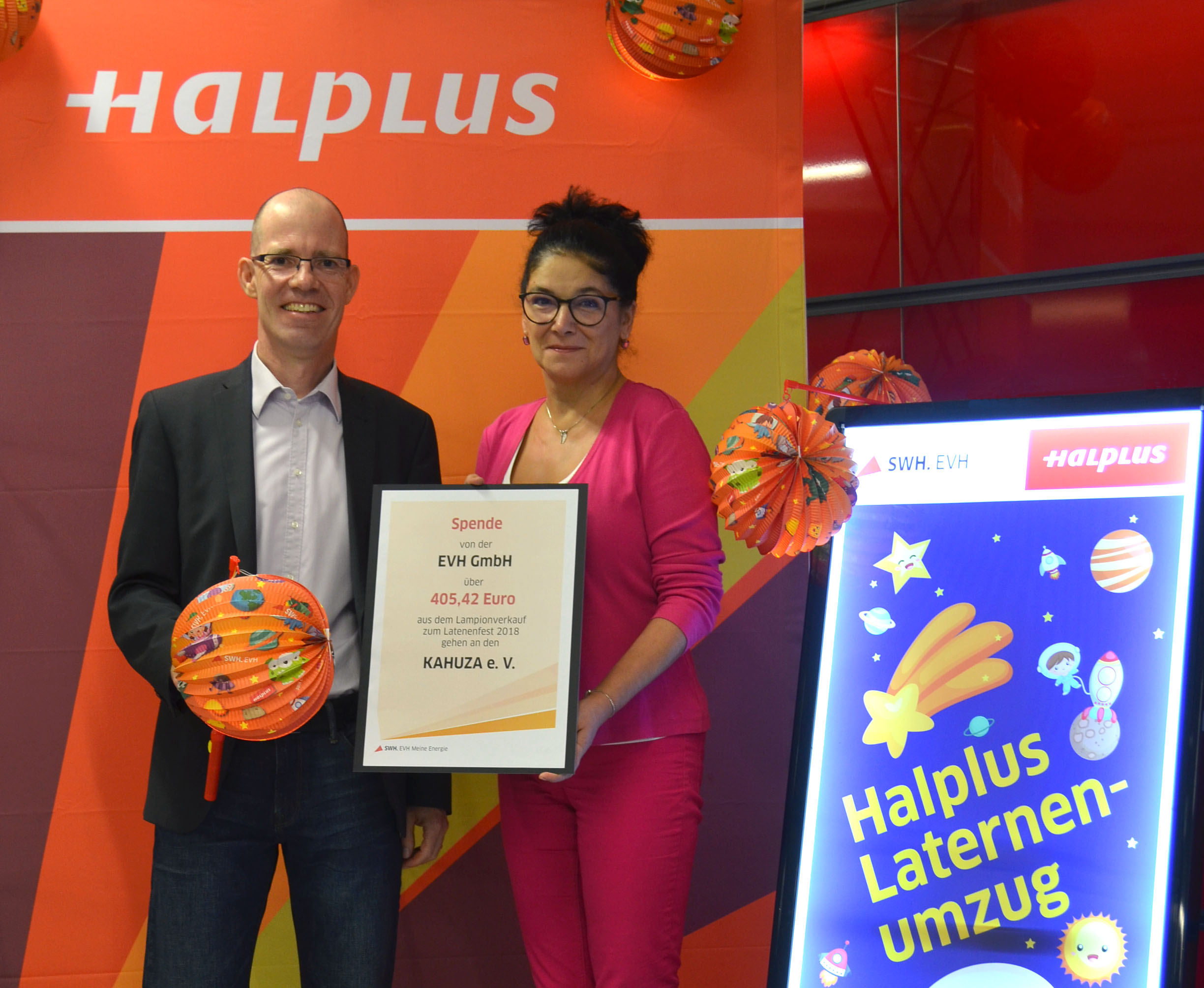 Diese Spendensumme kann sich sehen lassen: 405,42 Euro sammelte die EVH GmbH, ein Unternehmen der Stadtwerke Halle GmbH, beim diesjährigen Laternenfest. Gegen eine Spende von mindestens einem Euro überreichte die EVH an ihrem Stand die beliebten HALPLUS-Lampions für den am 25. August 2018 stattfinden Laternenumzug. Tina Witkowski, Vorstandsvorsitzende von KAHUZA e. V., nahm heute die Spende von Martin Schmitz, Leiter Energievertrieb der EVH GmbH, entgegen.