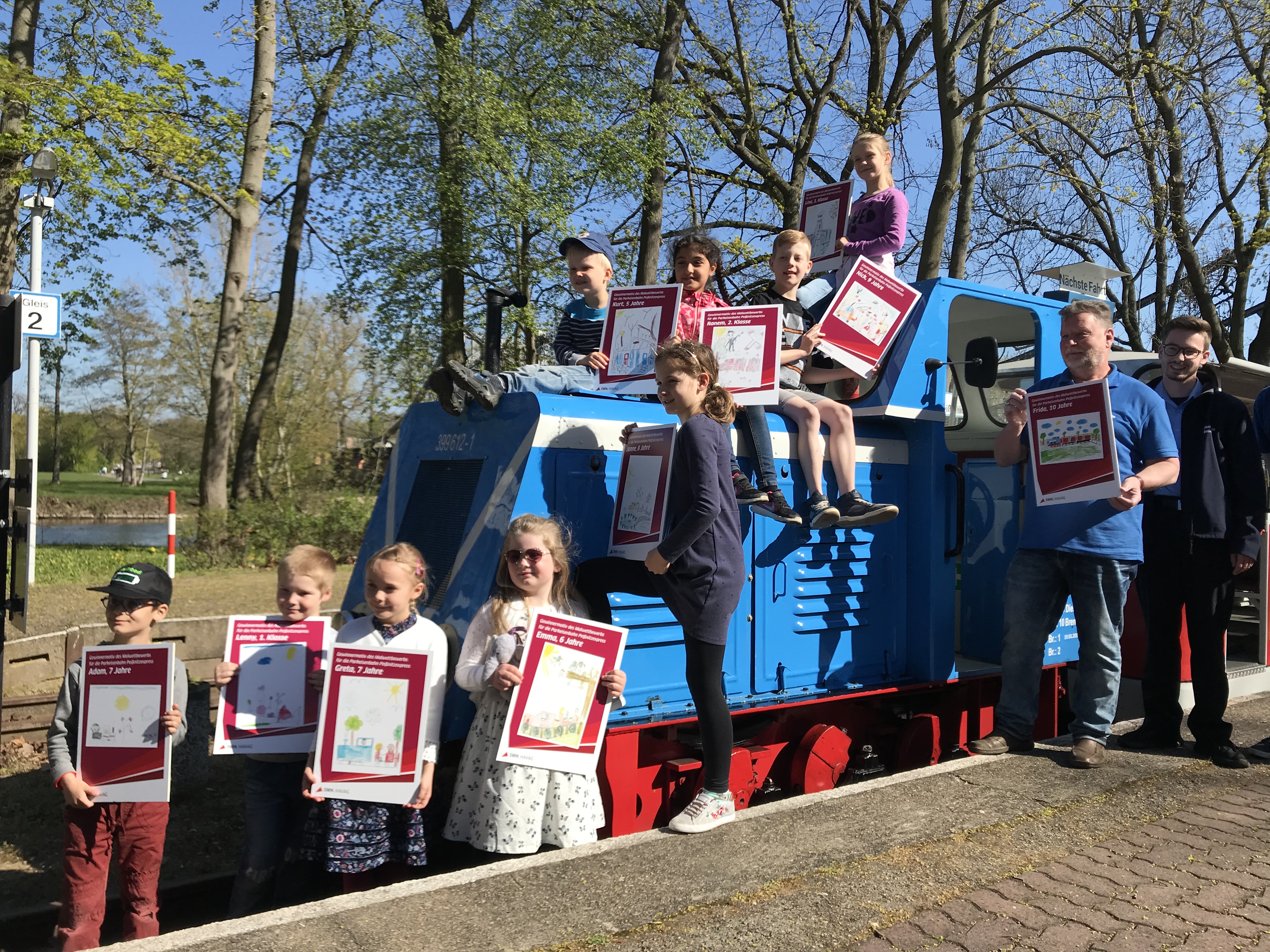 Unter allen Einsendungen haben zehn gewonnen. Heute fand die Preisverleihung am Bahnhof der Parkeisenbahn statt. Im Anschluss fuhren die Gewinner-Kinder und ihre Familien noch eine Extra-Runde mit der Parkeisenbahn.