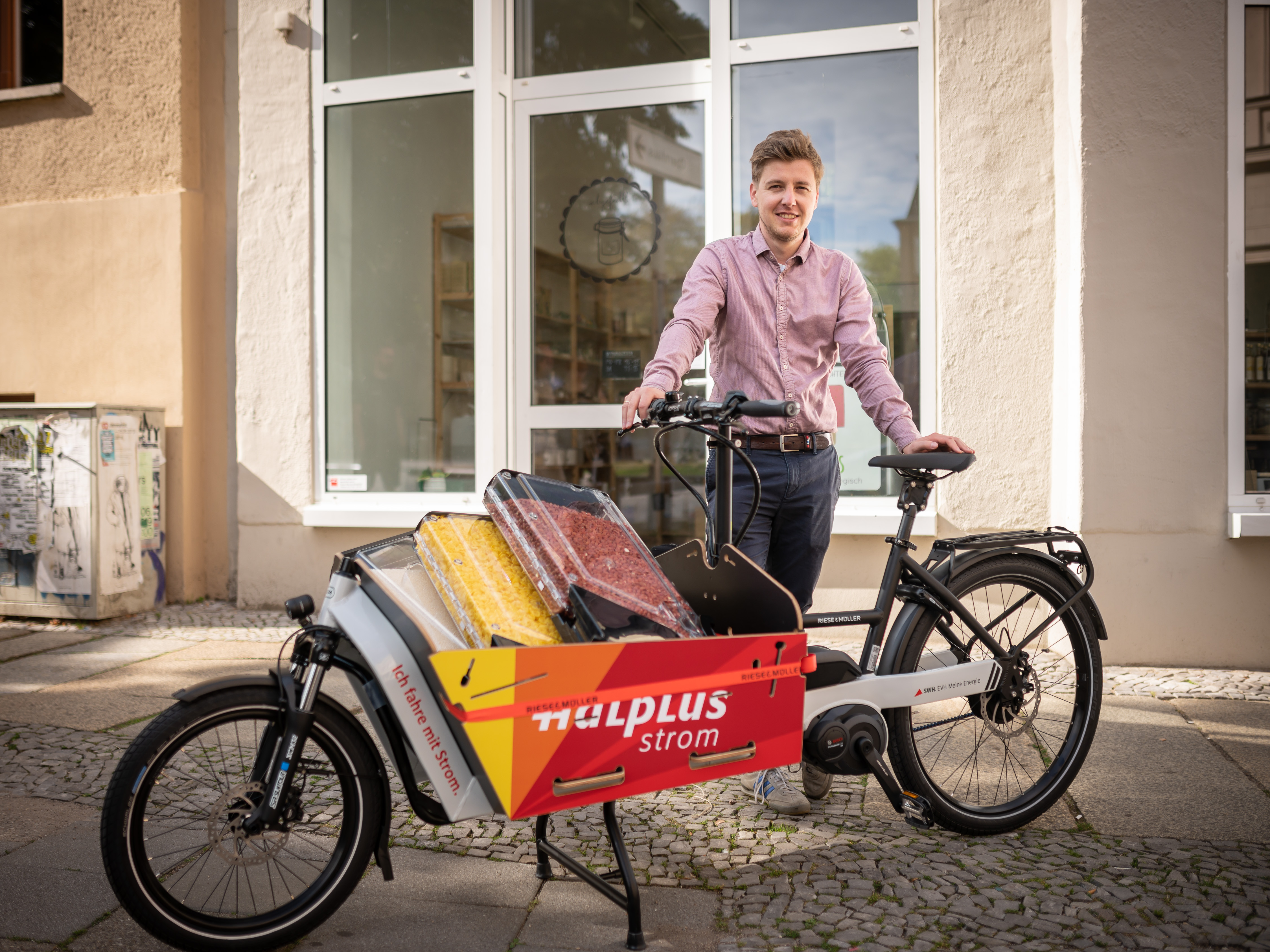 Florian Thürkow und Hannes Schulz betreiben Halles ersten Unverpackt-Laden, der bei den Hallenser*innen auf großes Kaufinteresse stößt. Um diesem gerecht zu werden und schnell Nachschub besorgen zu können, kommt das E-Lastenrad der Stadtwerke wie gerufen. Die Leih-Aktion versetzt sein Team in die Lage, Produkte der regionalen Herstellfirmen umweltfreundlich in den Laden am August-Bebel-Platz zu bringen. Zum Beispiel für den Transport von Gemüse und Obst ihres Lieferanten Biophilja aus Halle-Bruckdorf - denn das wäre einfach zu weit für ein normales Lastenrad.