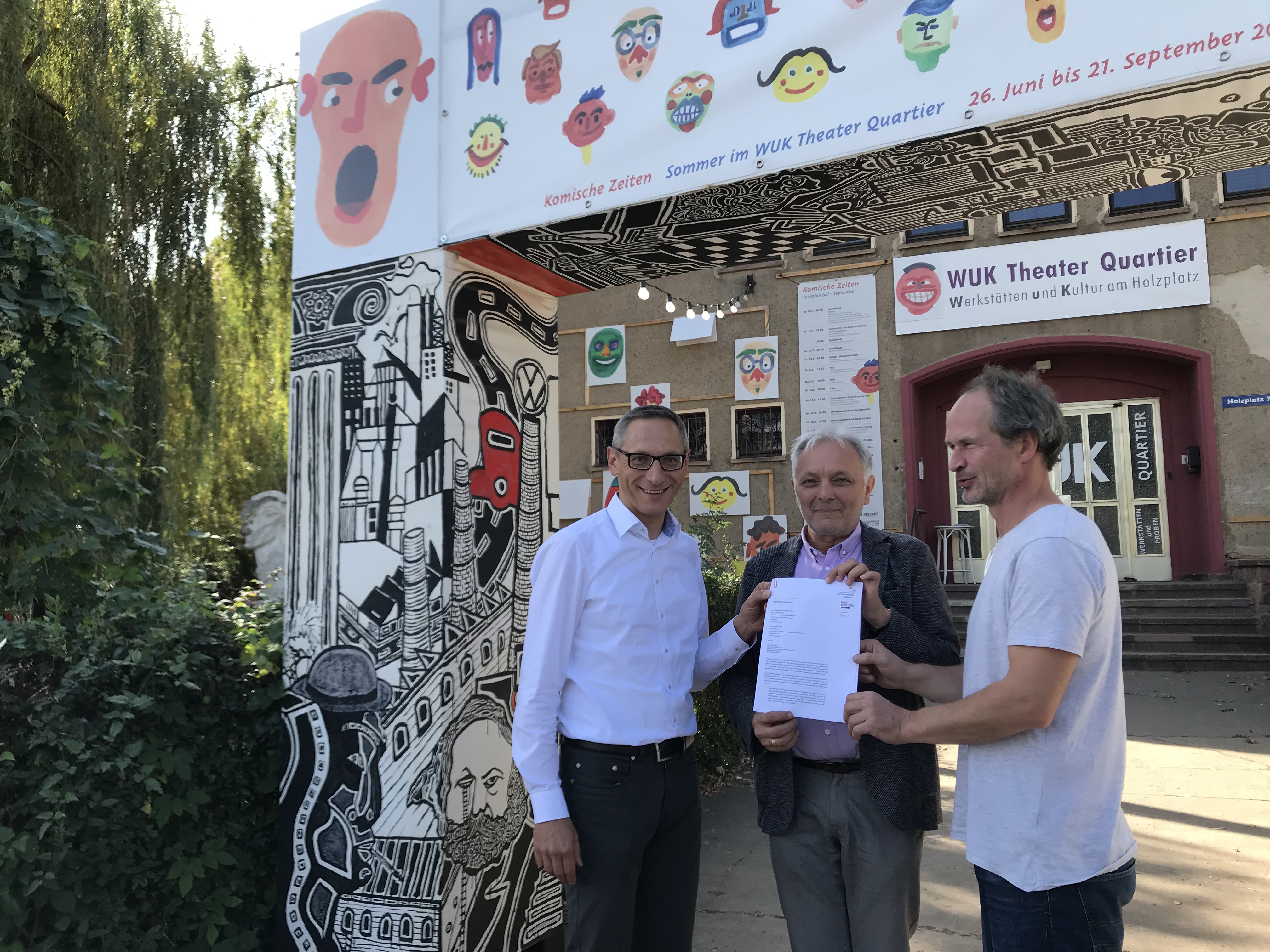 Unter dem Titel „Kennen wir uns?“ startet heute das einjährige Jugendtheaterprojekt des WUK Theater Quartier in Kooperation mit Outlaw (Kinder und Jugendhilfe), mit den Stadtwerken Halle und ihrer Tochter HAVAG. Ziel ist es, die soziale Kompetenz zu fördern, indem sich Auszubildende der Stadtwerke und Jugendliche aus sozial benachteiligten Familien kennenlernen, Alltagserfahrungen miteinander austauschen und spielerisch Projekte umsetzen. Tom Wolter, Künstlerischer Leiter und Geschäftsführer WUK Theater Quartier, Vinzenz Schwarz, Vorstand der Halleschen Verkehrs-AG (HAVAG), und Steffen Kröner, Regionaler Geschäftsführer Outlaw gGmbH, unterschrieben dafür heute gemeinsam den Kooperationsvertrag.