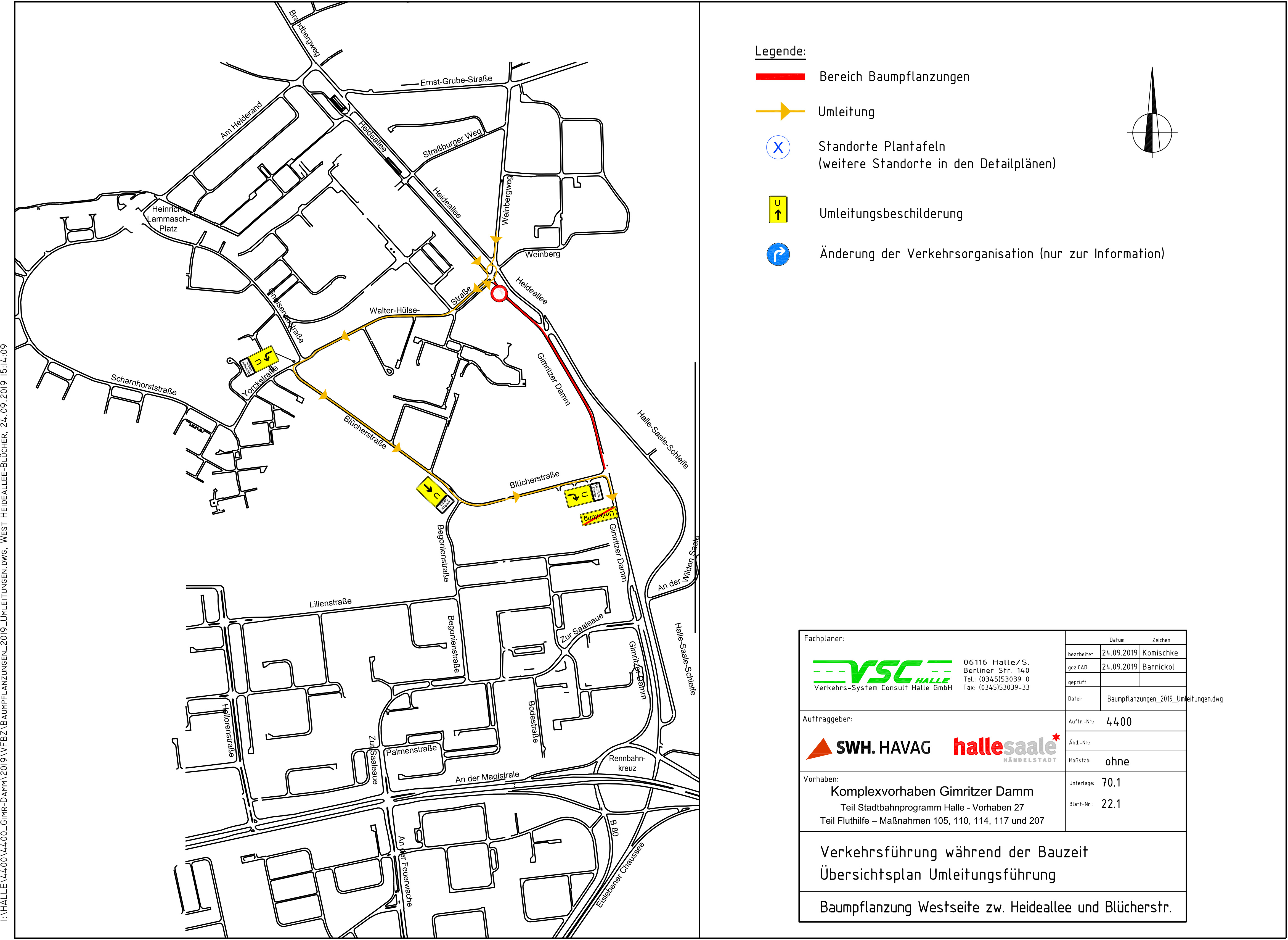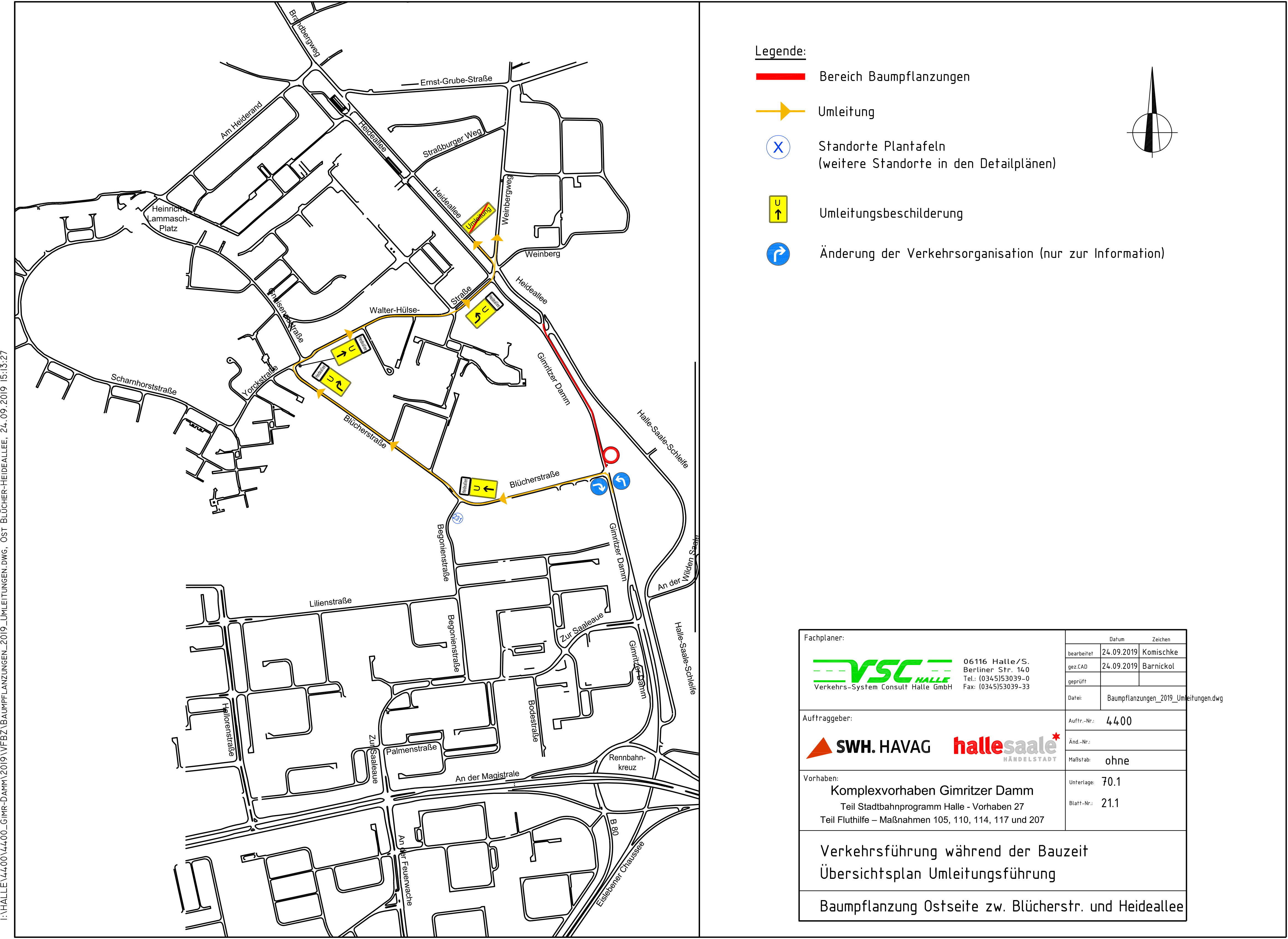 Von Mittwoch, 6. November, bis Montag, 11. November, wird deshalb die stadteinwärtige Richtungsfahrbahn (Westseite) ab dem Knotenpunkt Heideallee/Weinbergweg/Walter-Hülse-Straße bis Knotenpunkt Gimritzer Damm/Blücherstraße aufgrund der Pflanzarbeiten gesperrt. Die ausgeschilderte Umleitung des Verkehrs erfolgt über die Walter-Hülse-Straße/Blücherstraße.