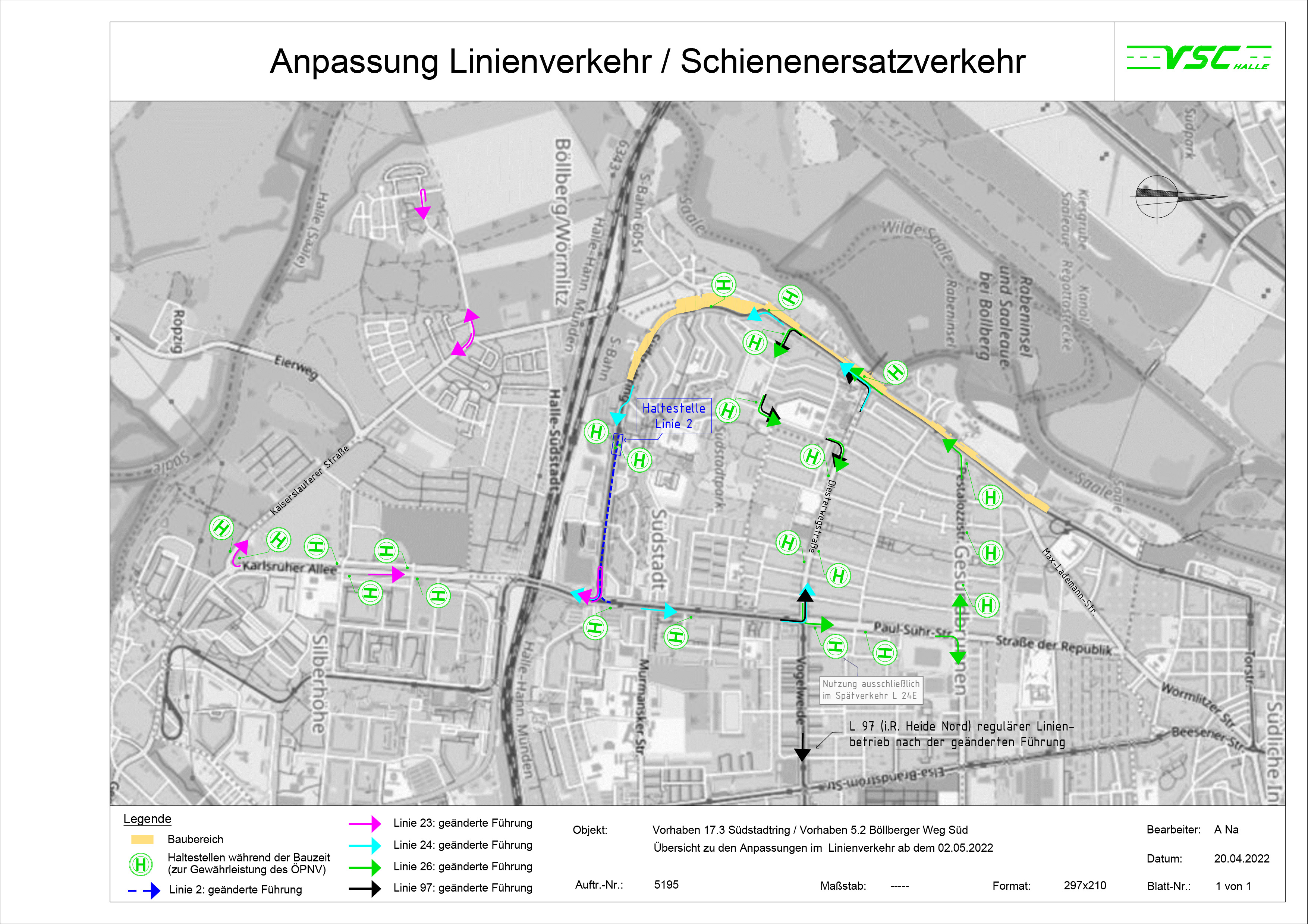 Die Straßenbahnlinie 1 fährt stadtauswärts verkürzt bis zur Haltestelle Böllberg. Die Straßenbahnlinie 2 wird ab der Haltestelle Südstadt, Veszpremer Straße bis zur Haltestelle S-Bf. Südstadt verlängert.