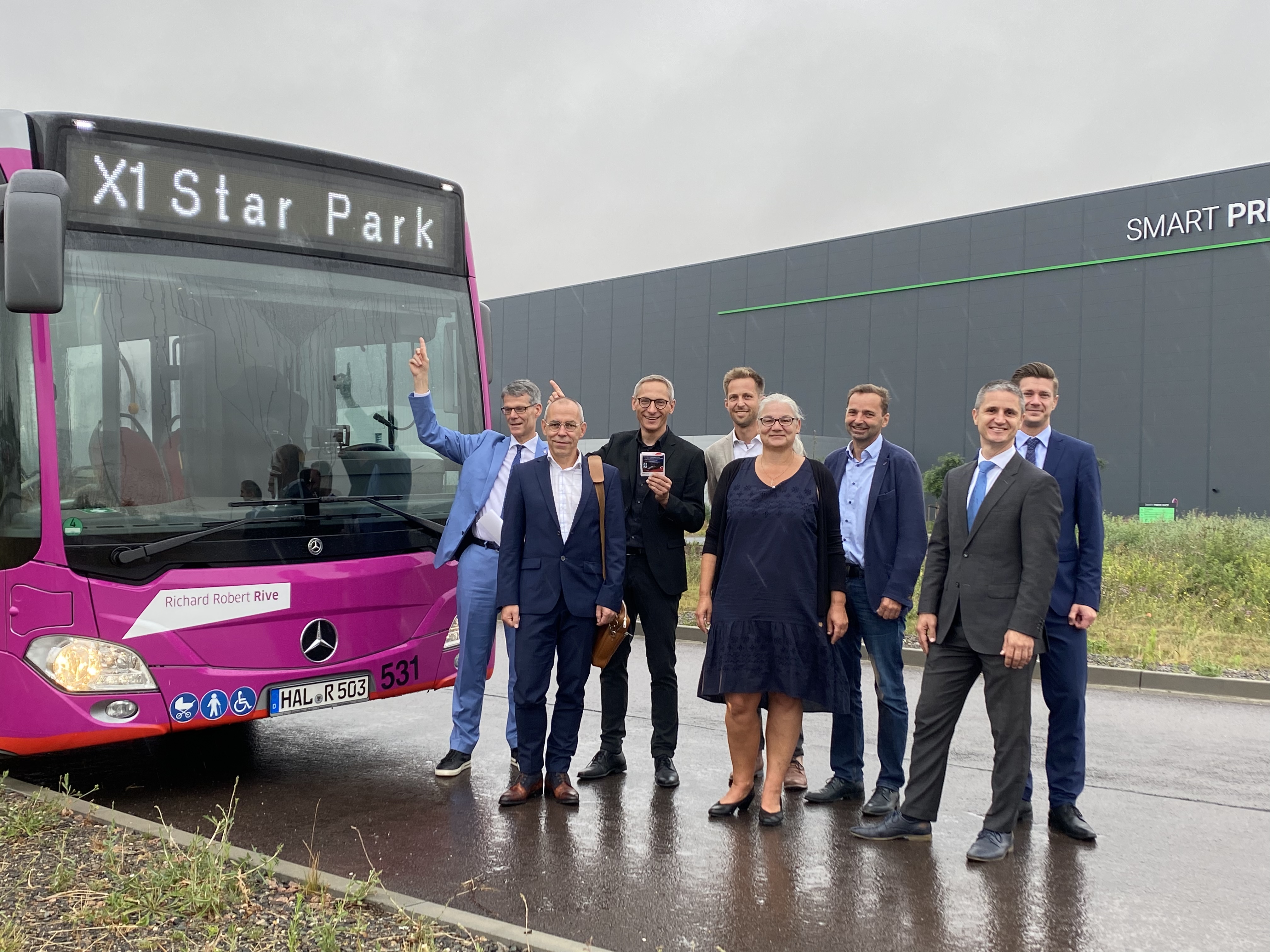 Die Hallesche Verkehrs-AG (HAVAG), ein Unternehmen der Stadtwerke Halle-Gruppe, setzt ab 1. Juli 2022 die erste Maßnahme des innovativen ÖPNV-Modellprojekts STADTLand+ um – die Einführung des Star Park Express. Zwei Express-Buslinien verbessern ab sofort die Anbindung des stetig wachsenden Industriegebietes Star Park Halle A 14 an die Stadt Halle (Saale) und verkürzen die Reisezeit für die dort Beschäftigten wesentlich. Beim heutigen Pressetermin stellten die Projektpartner*innen den neuen Star Park Express vor. Dabei waren Halles Bürgermeister Egbert Geier, HAVAG-Vorstand Vinzenz Schwarz, Robert Weber, Geschäftsführer der Entwicklungs- und Verwaltungsgesellschaft Halle-Saalkreis mbH, Grit Scholz, Stellvertreterin des Landkreises Saalekreis sowie Fabian Watzke als Stellvertreter der OBS/Vetter GmbH. Ziel von STADTLand+ ist es, CO2-Emissionen im Verkehrsbereich durch ein attraktiveres Angebot nachhaltig zu reduzieren. Das Projekt STADTLand+ wird im Rahmen des Förderprogramms "Modellprojekte zur Stärkung des ÖPNV" durch das Bundesministerium für Digitales und Verkehr gefördert. Alle Informationen und Teilprojekte stehen auf der Projektwebseite unter www.mitteldeutschland-vernetzt.de.