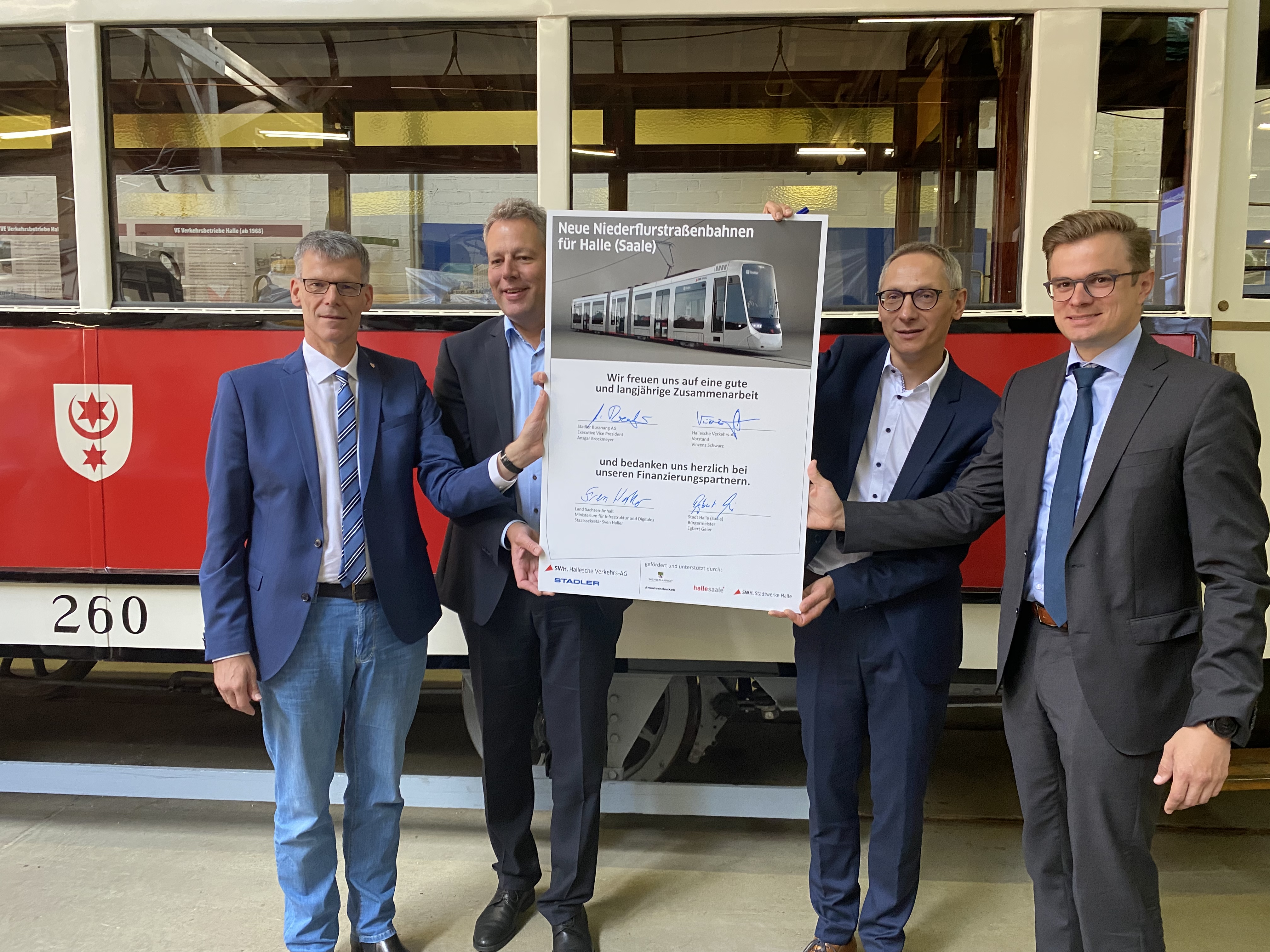 Die Entscheidung in der Ausschreibung über die neue Straßenbahngeneration für Halle (Saale) ist gefallen: Die Hallesche Verkehrs-AG (HAVAG), ein Unternehmen der Stadtwerke Halle-Gruppe, hat am Dienstag, 23. August 2022, einen Vertrag über die Lieferung von 56 Straßenbahntriebwagen des Typs TINA mit dem Schweizer Schienenfahrzeughersteller Stadler AG abgeschlossen. TINA steht für „Total Integrierter Niederflur-Antrieb“. Laut Vertrag sollen die ersten Fahrzeuge im vierten Quartal 2024 geliefert werden, ein Linieneinsatz ist ab Ende 2025 vorgesehen. Die neuen Bahnen dieser Serie werden die ÖPNV-Qualität für die Fahrgäste weiter ausbauen sowie die Klimaneutralität und die Mobilitätswende in Halle (Saale) weiter vorantreiben. Das Land Sachsen-Anhalt und die Stadt Halle (Saale) finanzieren die Gesamtinvestition mit einem Zuwendungsanteil von 60 Prozent, der Eigenanteil der HAVAG bzw. Stadtwerke Halle beträgt 40 Prozent.