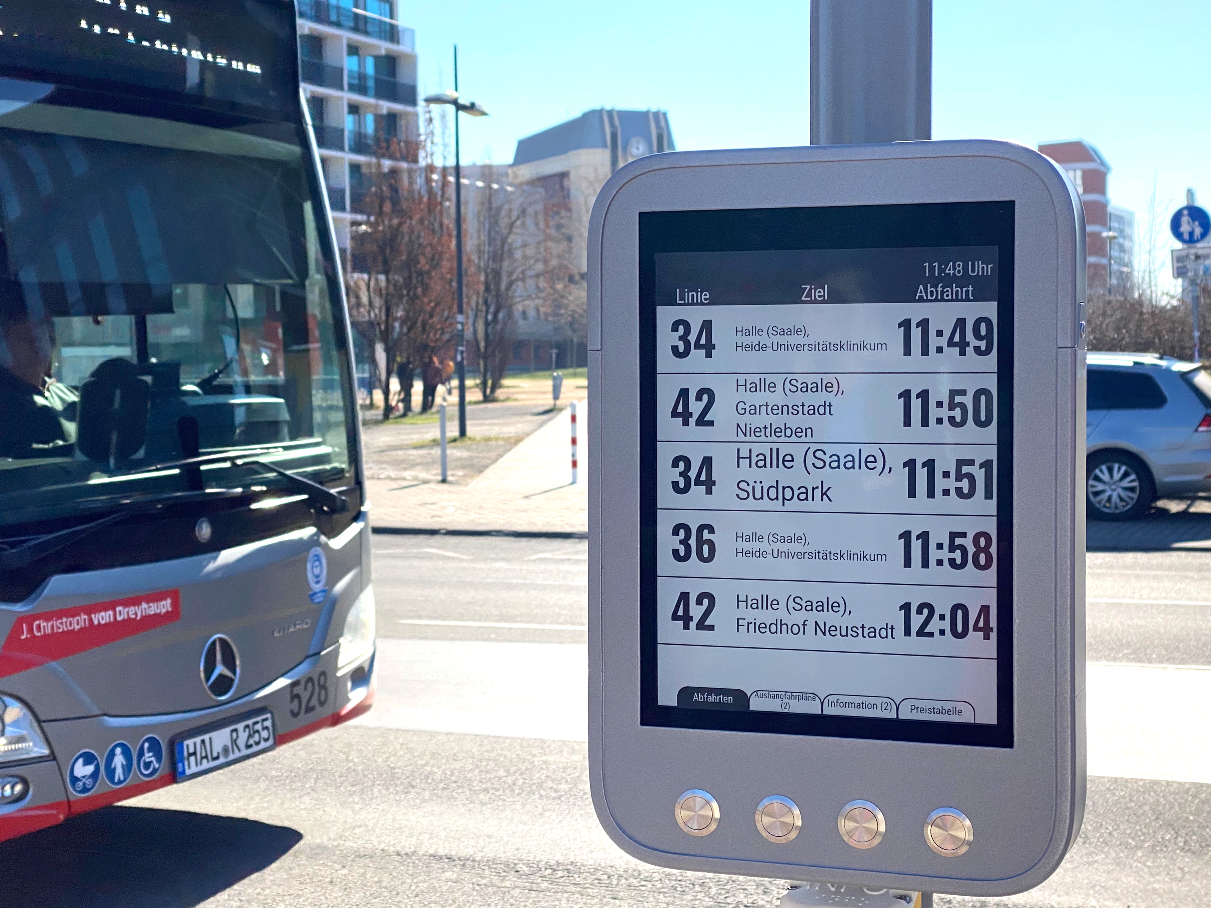 Die Hallesche Verkehrs-AG (HAVAG), ein Unternehmen der Stadtwerke Halle-Gruppe, tauscht für ein Pilotprojekt an zwei Haltestellen im Stadtgebiet den Papierfahrplan gegen ein E-Paper Anzeigesystem ein. Nie wieder inaktuelle Fahrpläne, dynamische Fahrplaninformationen in Echtzeit und aktuelle Baustelleninformationen sind nur einige der vielen Vorteile dieser modernen Displaytechnologie. An der Haltestelle „Am Bruchsee“ in Halle-Neustadt stellte heute HAVAG-Haltestellenmanager Maximilian Ulbricht die neuen E-Paper vor. Die HAVAG folgt damit der Digitalisierungsstrategie der Stadtwerke Halle, um das Leben in unserer Stadt noch besser zu machen. Außerdem trägt diese papierlose und umweltfreundliche Alternative zu mehr Nachhaltigkeit in der Unternehmensgruppe und auch in Halle (Saale) bei.