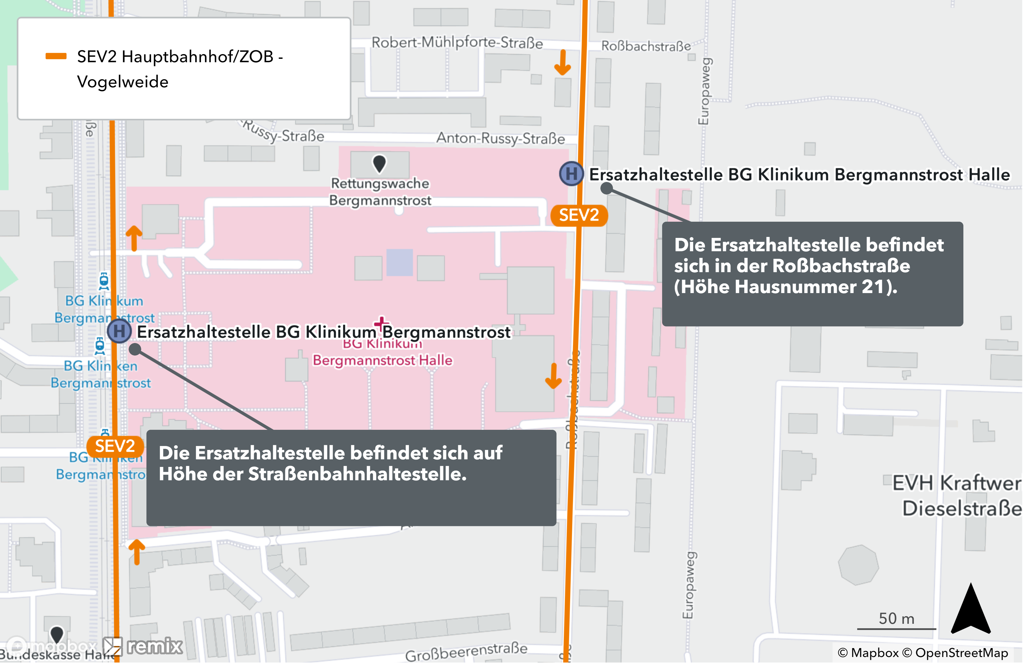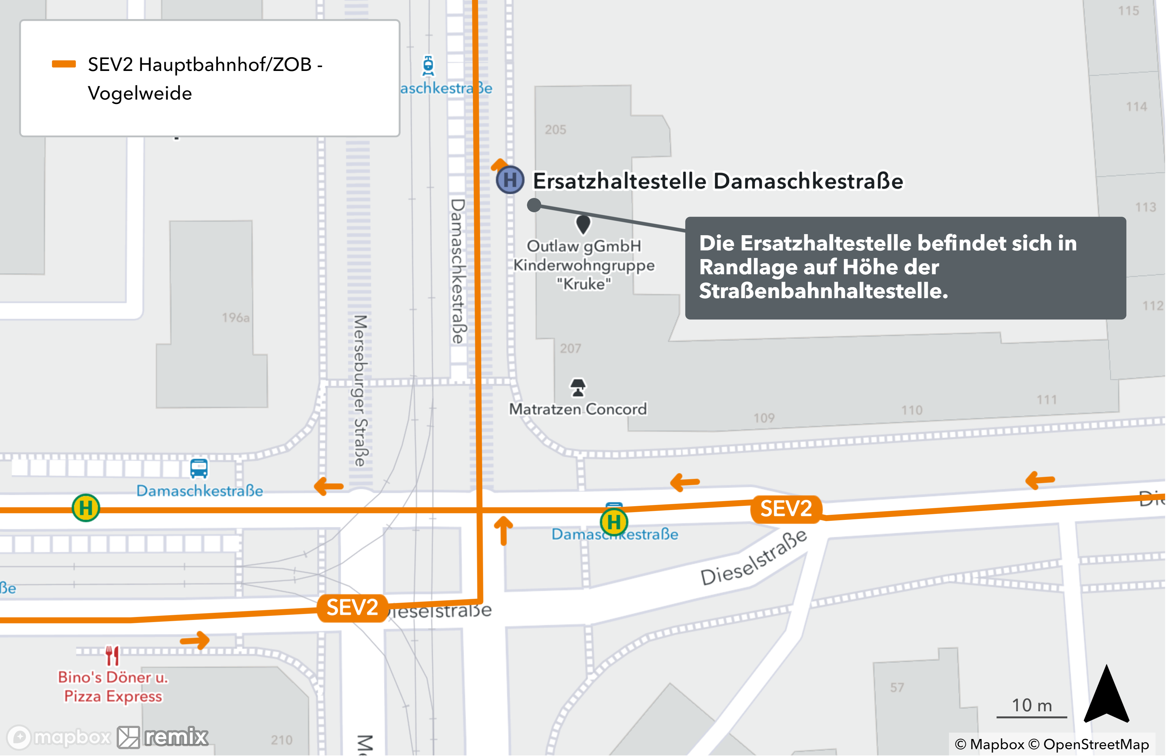 Als Ersatz für die Linien 2 und 5 fährt der Schienenersatzverkehrs-Bus (SEV 2) im Tages- und Spätverkehr im 20-Minuten-Takt sowie im Nachtverkehr abgestimmt auf die Straßenbahnlinien vom Sammelanschluss Marktplatz zwischen den Haltestellen „Hauptbahnhof“, „Damaschkestraße“ und „Vogelweide“. Zusätzlich wird die Haltestelle „Riebeckplatz“ am ehemaligen Hotel „Maritim“ bedient. Zur Erreichbarkeit des BG Klinikum Bergmannstrost wird eine Ersatzhaltestelle in Richtung Hauptbahnhof auf Höhe der Straßenbahnhaltestelle eingerichtet sowie in Richtung Vogelweide in der Roßbachstraße (Höhe Hausnummer 21). Die Haltestelle „Huttenstraße“ wird weiterhin nicht bedient.