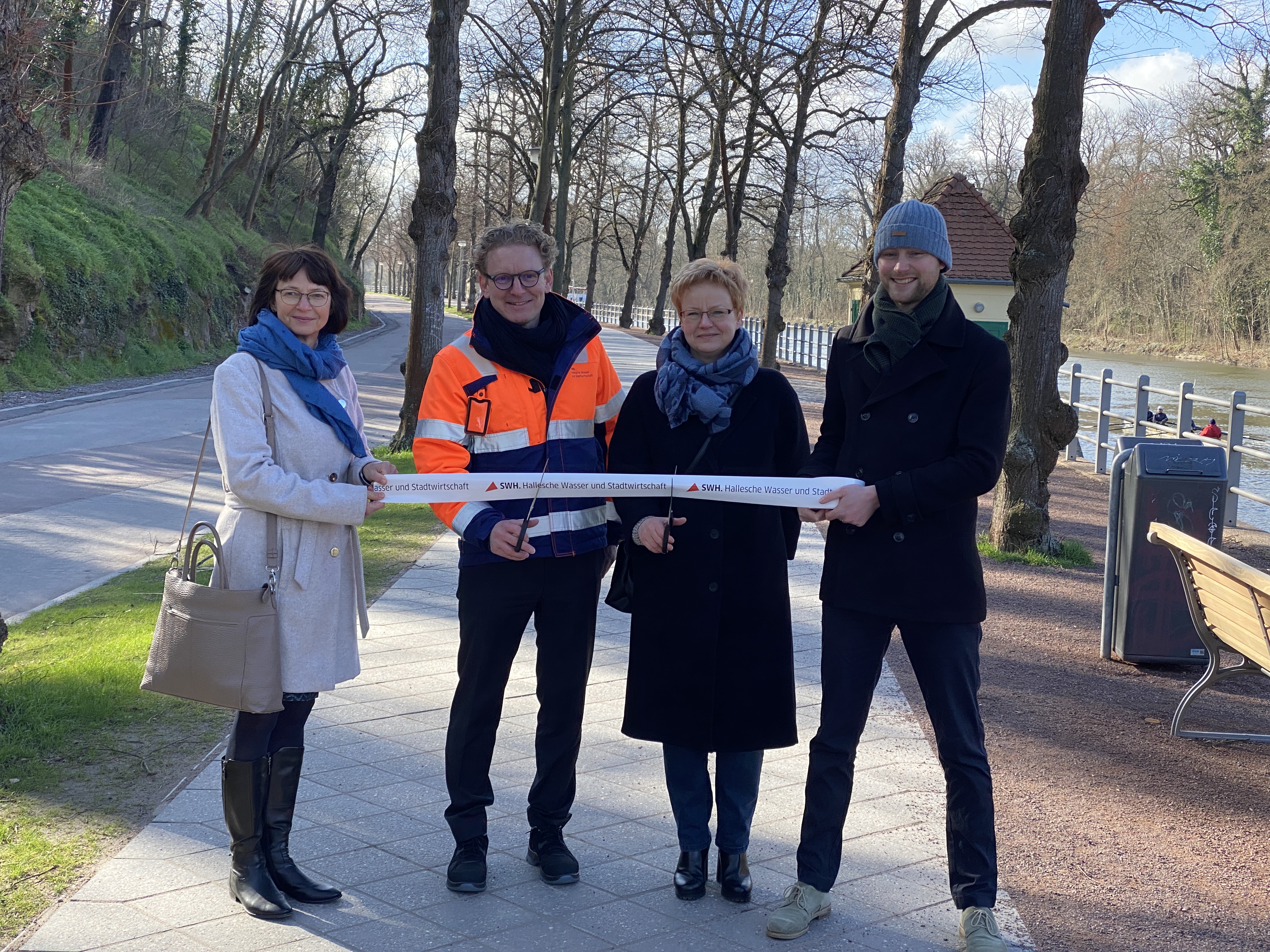 Die Stadt Halle (Saale) und die Hallesche Wasser und Stadtwirtschaft (HWS), ein Unternehmen der Stadtwerke Halle-Gruppe, erneuern gemeinsam nach denkmalgerechten Vorgaben den Promenadenbereich am Riveufer. Simone Trettin, Leiterin Freiraumplanung der Stadt Halle, Wolfgang Piller, Abteilungsleiter Straßen- und Brückenbau der Stadt Halle, Matthias Lux, Vorsitzender Geschäftsführer der Stadtwerke Halle GmbH, Peter Günther, Geschäftsführer der HWS, Annette Ueberschär, Abteilungsleiterin der HWS und Florian Hilger, Fachingenieur der HWS durchschnitten gemeinsam symbolisch am 28. März 2023 das Band zur erfolgreichen Fertigstellung des Gehweges Promenade Riveufer und der neuen Hauptsammlerabdeckungen.