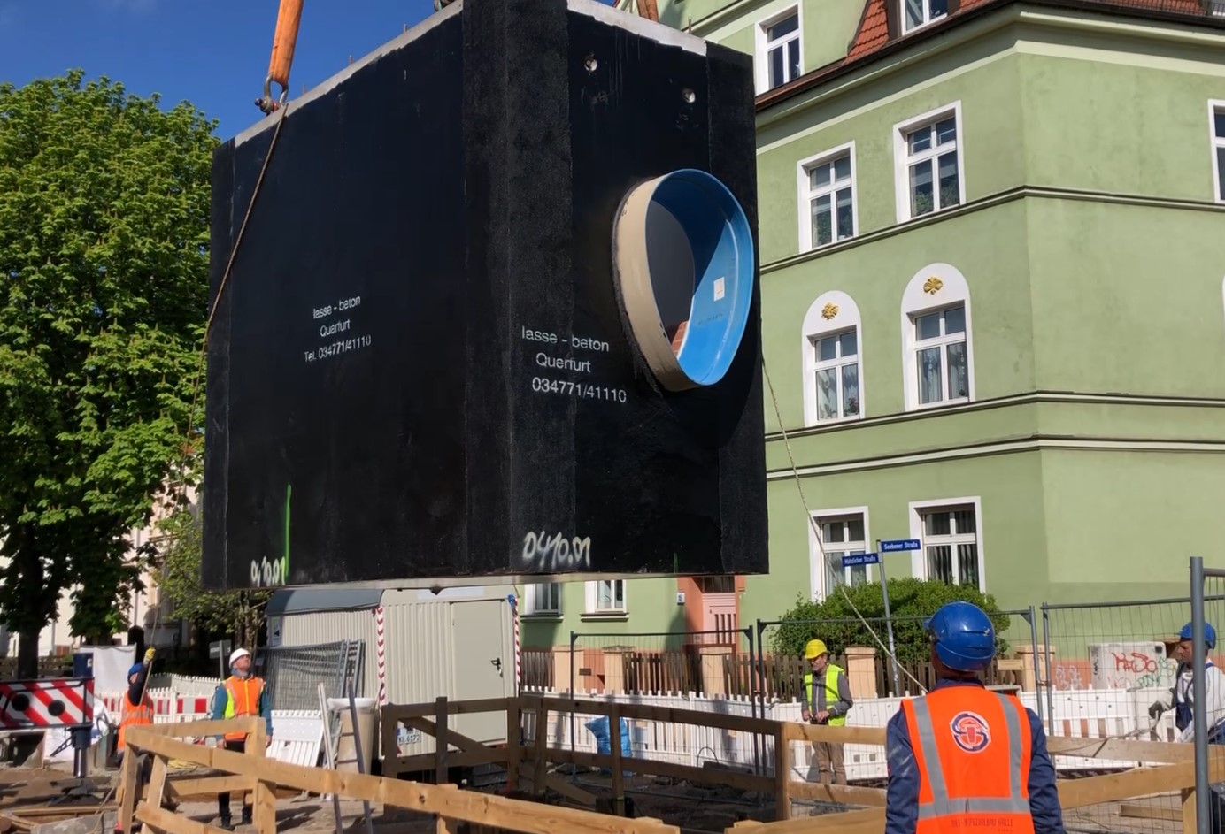 Seit November 2022 erneuert die HWS die sanierungsbedürftige Abwasserinfrastruktur im Umfeld der Mötzlicher Straße und Seebener Straße auf einer Gesamtlänge von etwa 520 Metern. In diesem Zusammenhang wird am Mittwoch, 31. Mai 2023, erneut ein werkseitig hergestelltes Sonderbauwerk mithilfe eines Schwerlasttransportes auf die Baustelle geliefert und eingebaut.
