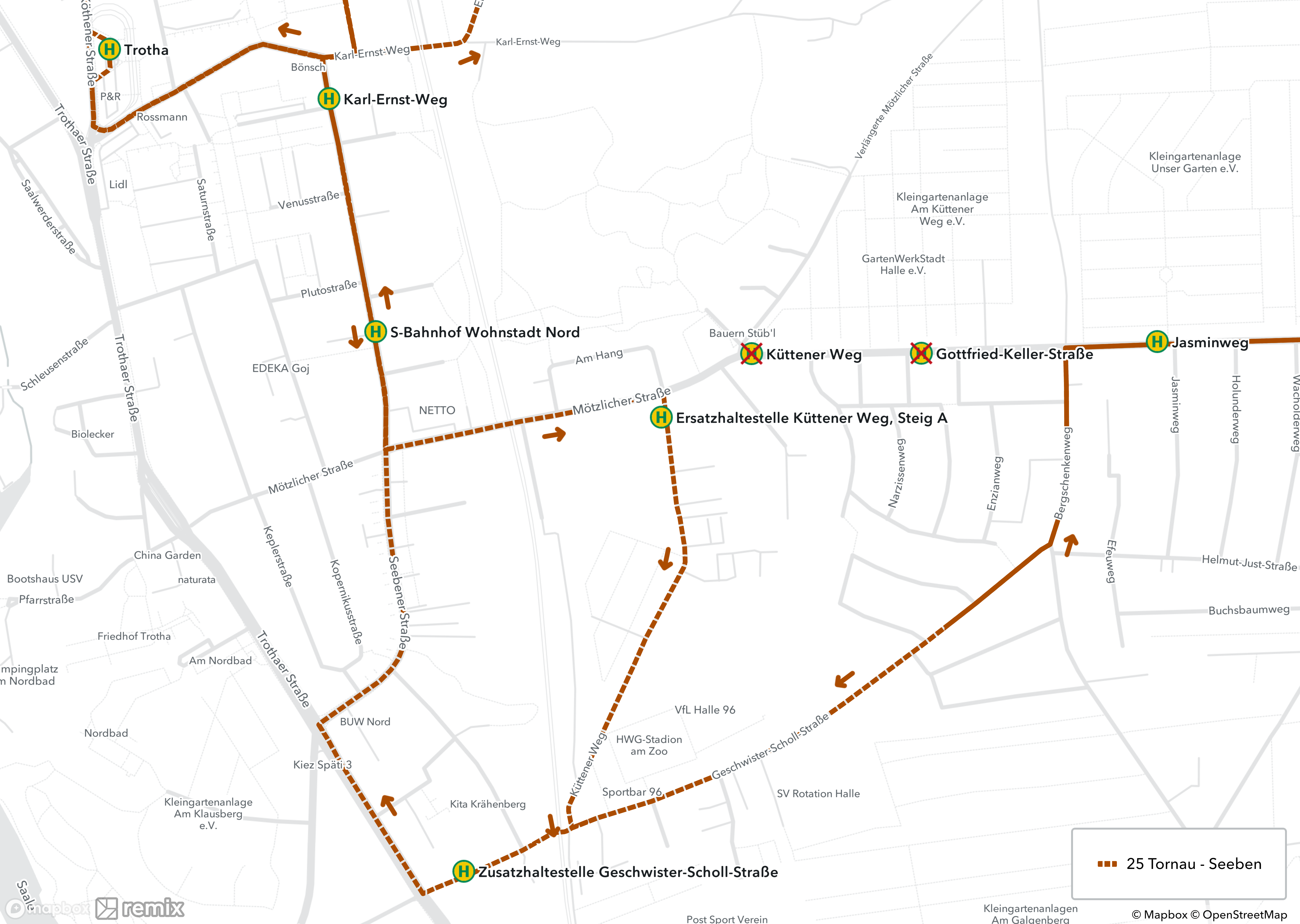 Während der Sperrung wird die HAVAG-Buslinie 25 in Richtung Seeben und Tornau umgeleitet. Die Busse in Richtung Tornau fahren ab der Ersatzhaltestelle Küttener Weg direkt zur Haltestelle Jasminweg. In Richtung Seeben fahren die Busse ab der Haltestelle Jasminweg direkt zur Zusatzhaltestelle Geschwister-Scholl-Straße und weiter in Richtung S-Bf. Wohnstadt Nord. Die Ersatzhaltestelle Küttener Weg in Richtung Tornau befindet sich im Küttener Weg/Ecke Mötzlicher Straße. In Richtung Seeben wird die Haltestelle Küttener Weg nicht bedient, die Haltestelle Gottfried-Keller-Straße wird im Sperrzeitraum in beiden Richtungen nicht angefahren. Als Alternative können Fahrgäste der Buslinie 25 die Haltestelle Jasminweg nutzen.