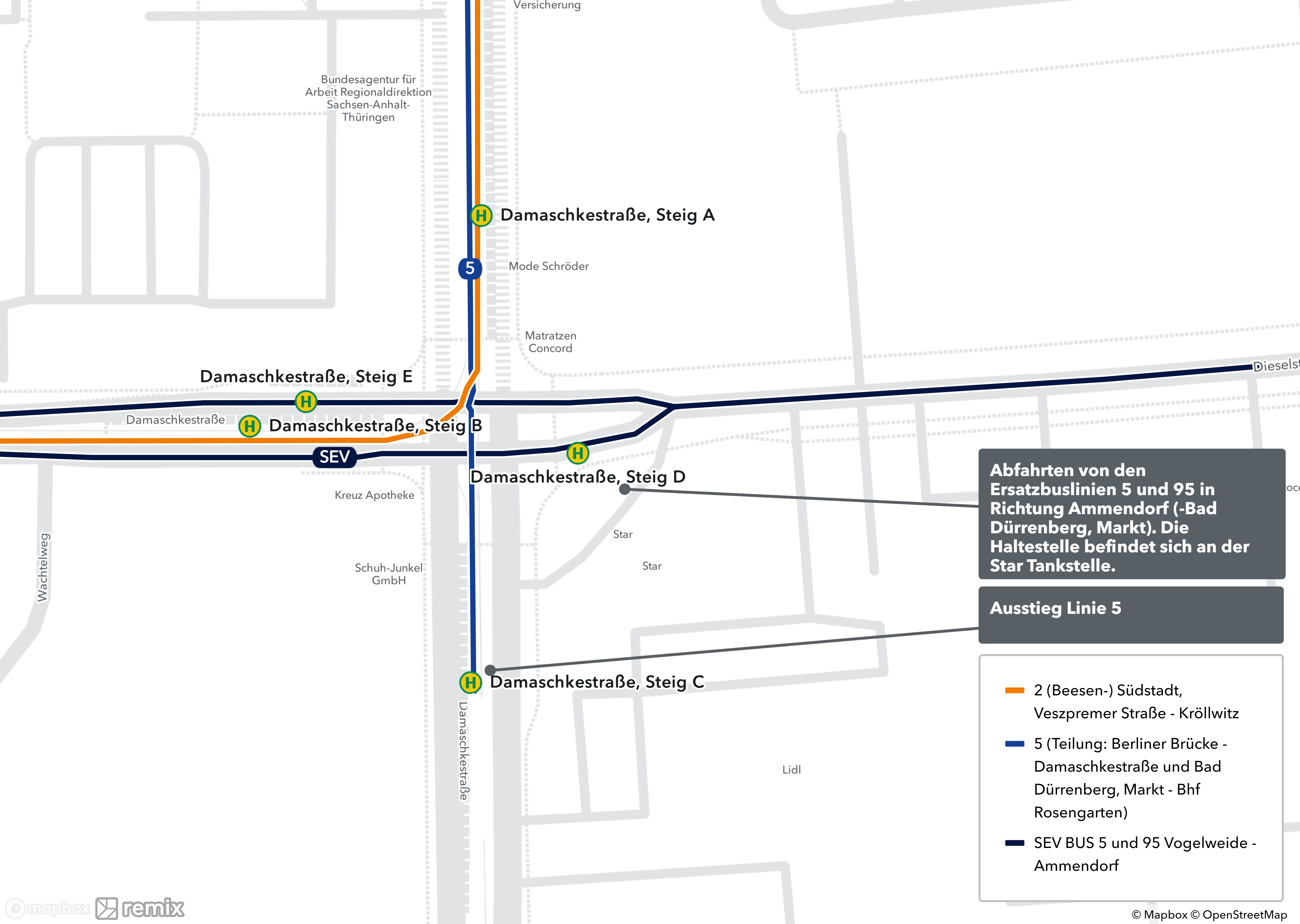 Die Straßenbahnlinie 95 wird ab der Haltestelle Vogelweide weiter zu Endhaltestelle Elsa-Brändström-Straße umgeleitet. Ein Anschluss wird zwischen der Straßenbahnlinie 95 und dem BUS SEV 95 an der Haltestelle Vogelweide eingerichtet. Fahrgäste, die weiter in Richtung Ammendorf möchten, nutzen bitte den BUS SEV 95 ab der Zusatzhaltestelle „Vogelweide“ eingangs der Damaschkestraße.