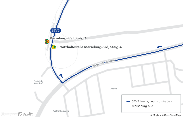 Der BUS SEV 5 fährt als Ersatz für die Straßenbahnlinie 5 auf der Route: Leuna, Leunatorstraße – Merseburg, Glück-Auf-Straße – Merseburg, Naumburger Straße – Merseburg-Süd – Merseburg, Naumburger Straße – Merseburg, Glück-Auf-Straße – Leuna, Leunatorstraße. Fahrgäste in Richtung Merseburg, Zentrum bzw. Halle, Berliner Brücke nutzen bitte den BUS SEV 5 bis zur Haltestelle Leuna, Leunatorstraße und steigen dort in die TRAM 5 um.